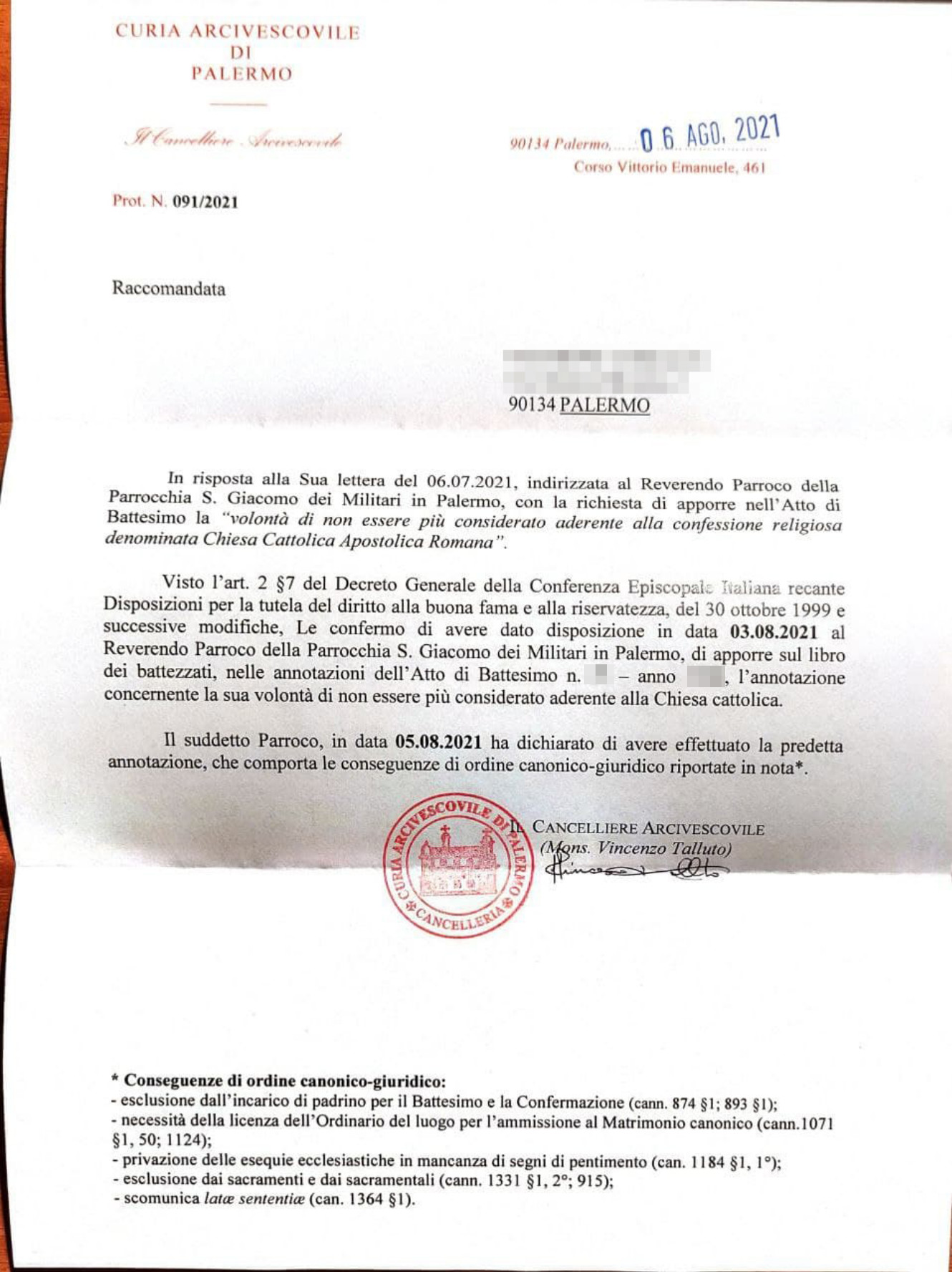 Una persona ha chiesto la rettifica dei dati relativi al proprio battesimo avvenuto a S. Giacomo dei Militari - PALERMO (PA) il 10/08/2021, dichiarando di non voler più far parte della Chiesa Cattolica.