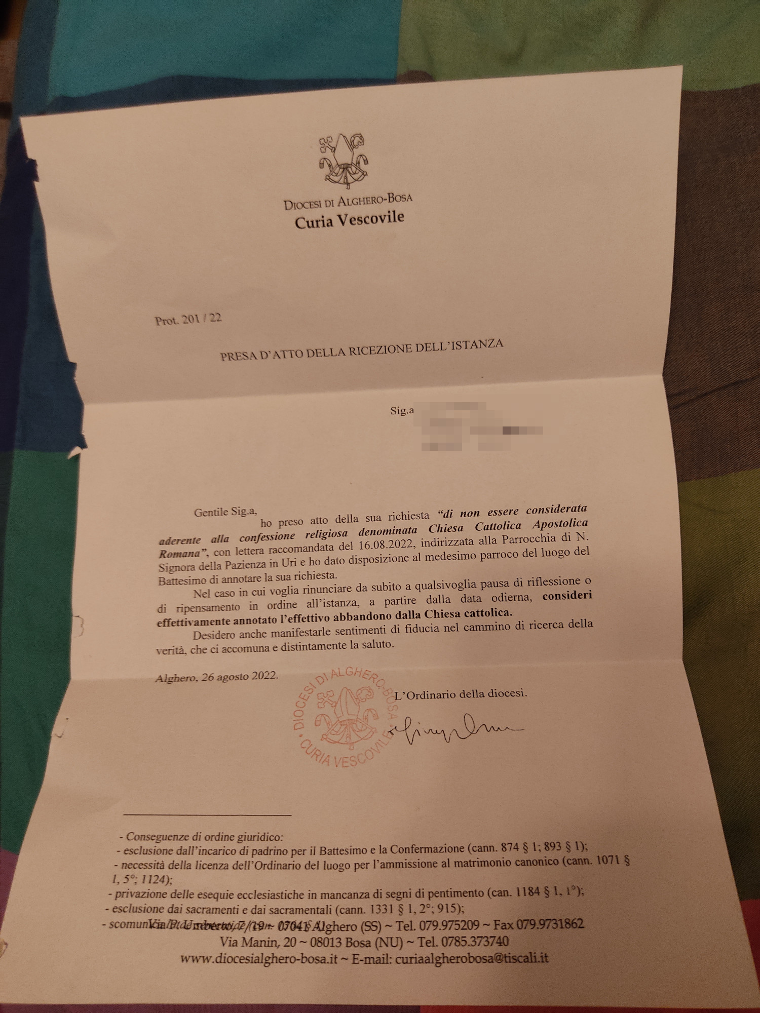 Una persona ha chiesto la rettifica dei dati relativi al proprio battesimo avvenuto a N. S. della Pazienza - URI (SS) il 15/09/2022, dichiarando di non voler più far parte della Chiesa Cattolica.