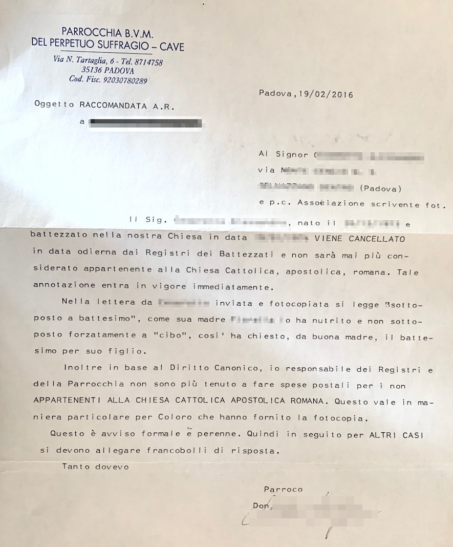Una persona ha chiesto la rettifica dei dati relativi al proprio battesimo avvenuto a Beata Vergine Maria del Perpetuo Suffragio alle Cave - PADOVA (PD) il 16/02/2016, dichiarando di non voler più far parte della Chiesa Cattolica.