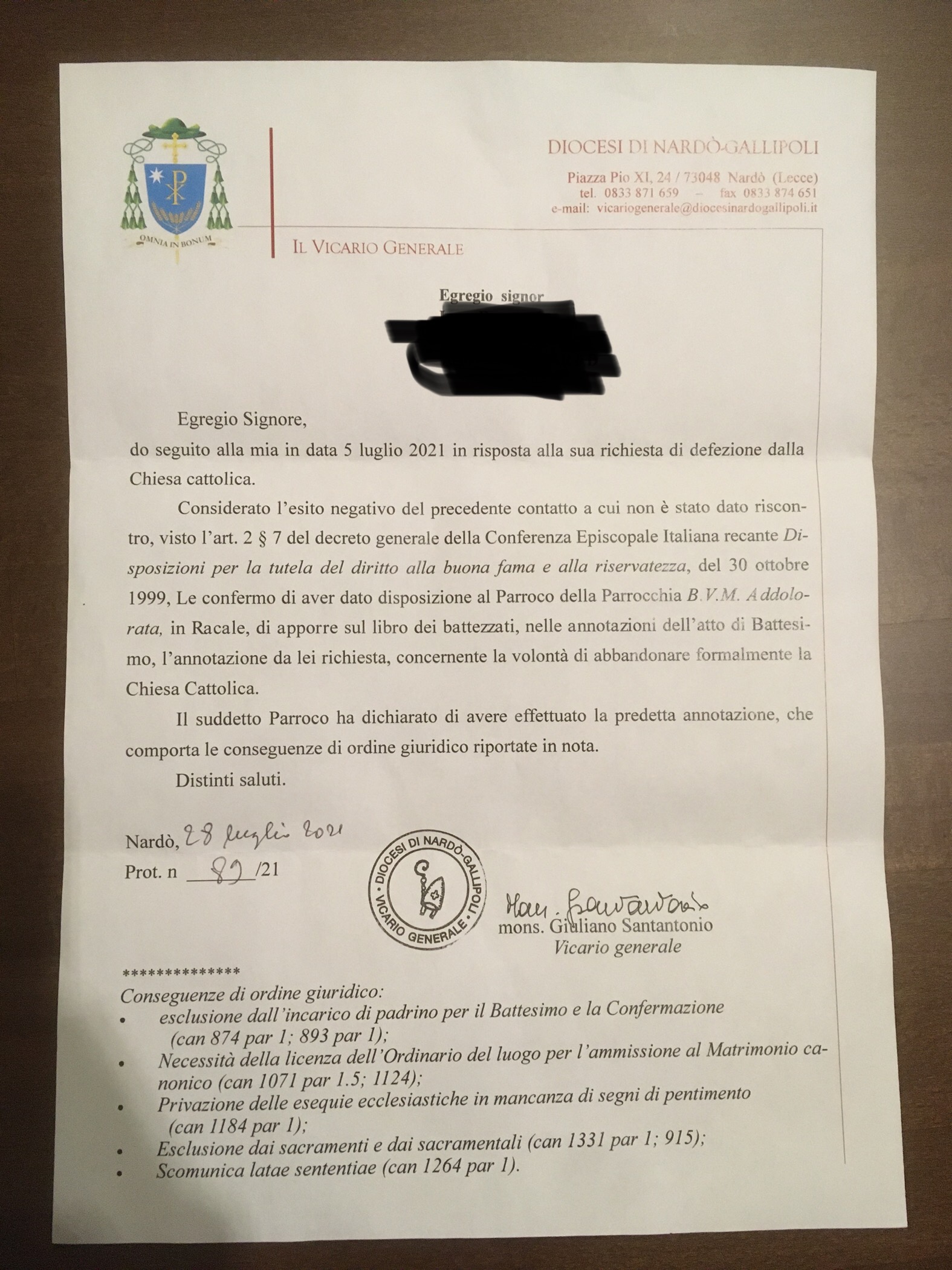 Una persona ha chiesto la rettifica dei dati relativi al proprio battesimo avvenuto a Beata Vergine Maria Addolorata - RACALE (LE) il 28/07/2021, dichiarando di non voler più far parte della Chiesa Cattolica.