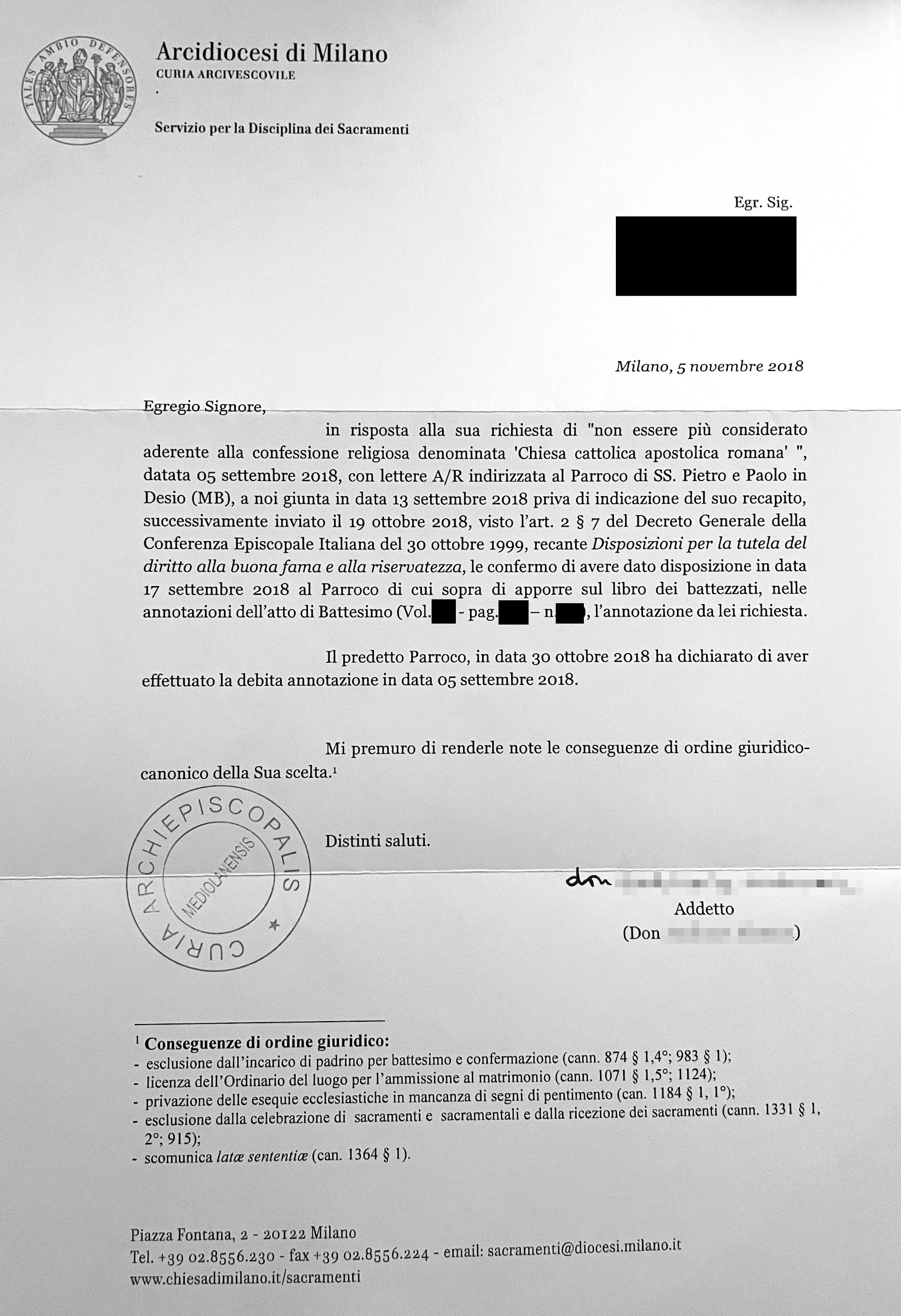 Una persona ha chiesto la rettifica dei dati relativi al proprio battesimo avvenuto a Santi Pietri e Paolo - DESIO (MB) il 05/11/2018, dichiarando di non voler più far parte della Chiesa Cattolica.