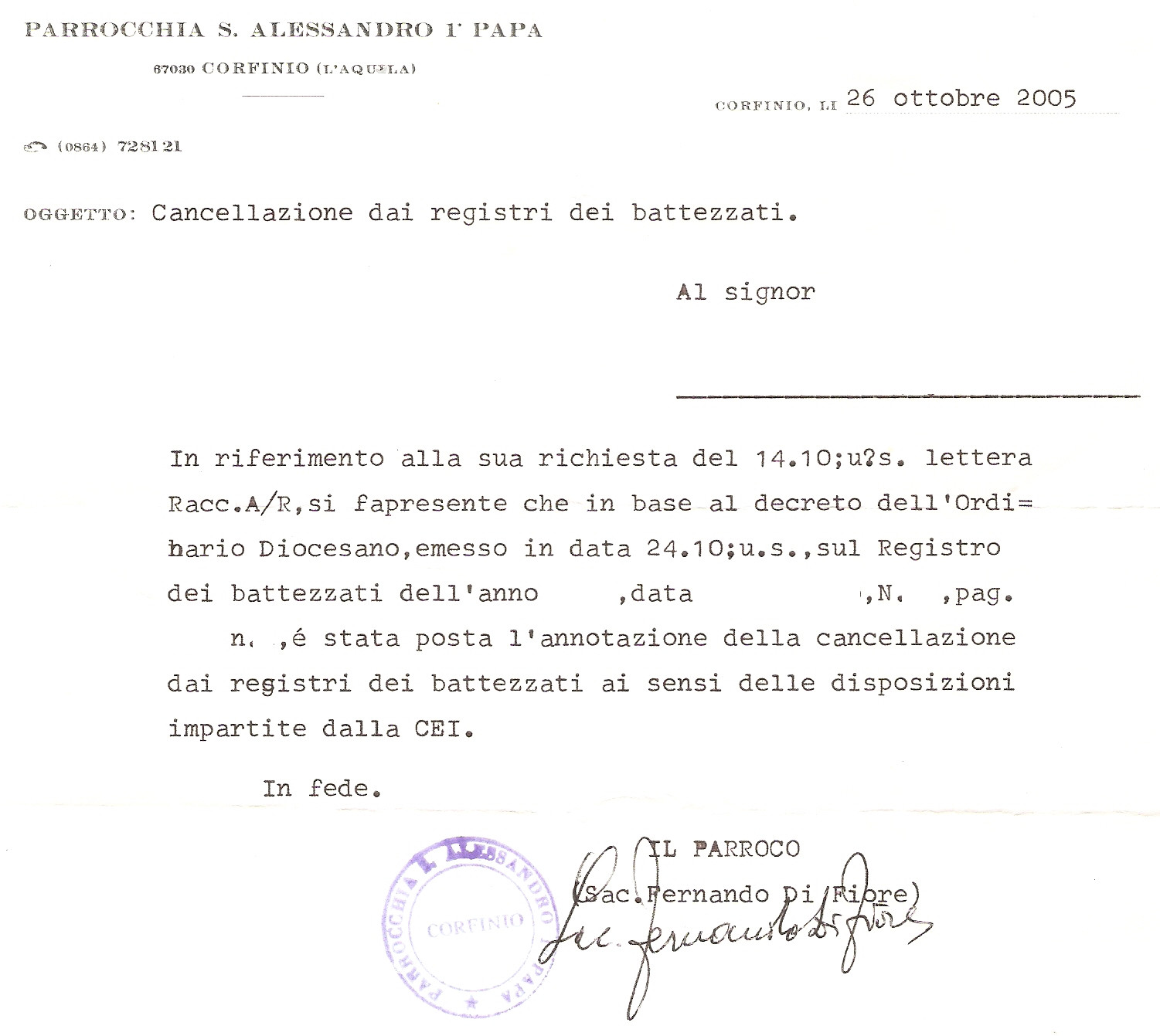 Una persona ha chiesto la rettifica dei dati relativi al proprio battesimo avvenuto a S. Alessandro I Papa - CORFINIO (AQ) il 26/10/2005, dichiarando di non voler più far parte della Chiesa Cattolica.