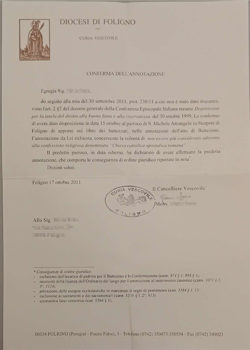 Una persona ha chiesto la rettifica dei dati relativi al proprio battesimo avvenuto a San Michele Arcangelo - FOLIGNO (PG) il 17/10/2011, dichiarando di non voler più far parte della Chiesa Cattolica.