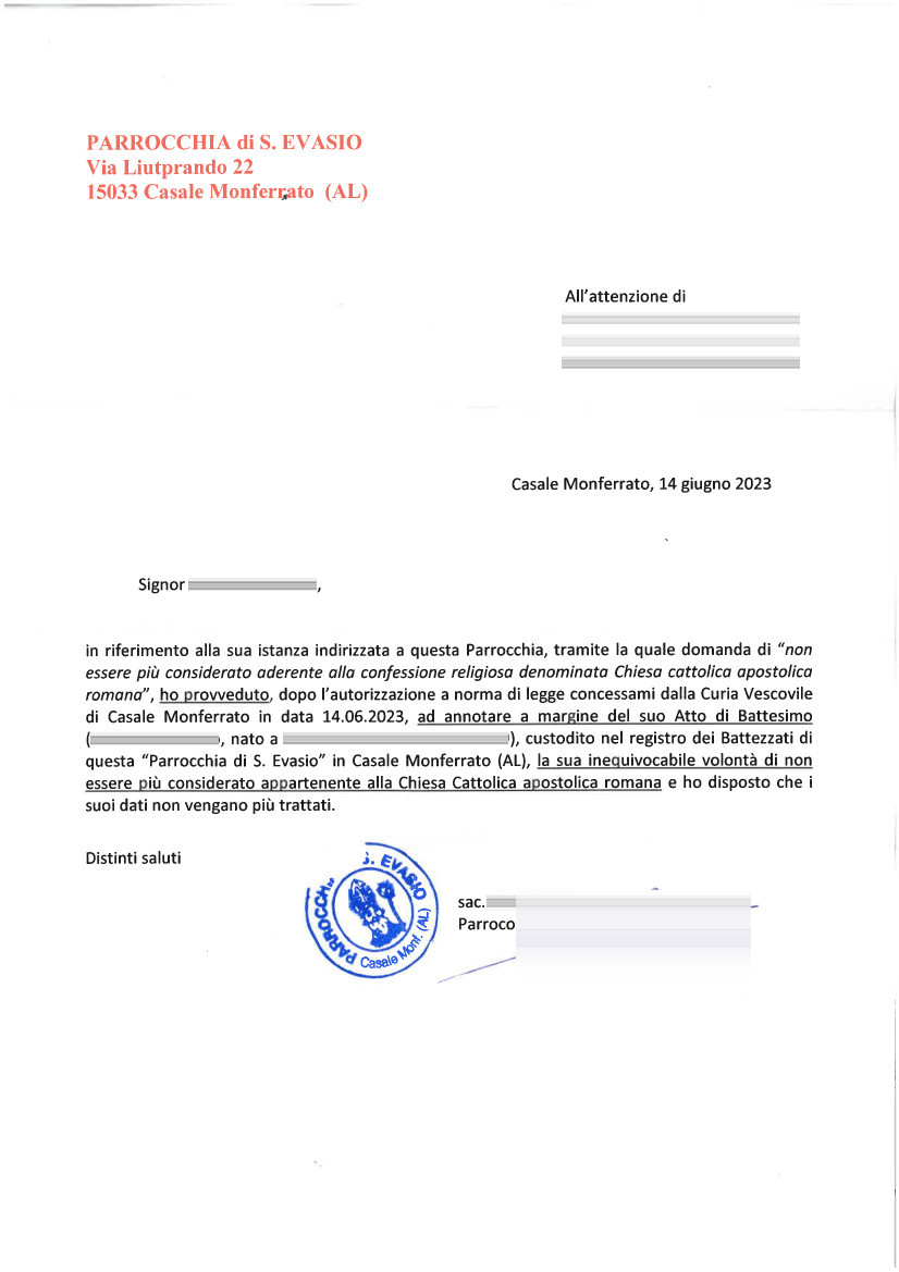 Una persona ha chiesto la rettifica dei dati relativi al proprio battesimo avvenuto a S. Evasio - CASALE MONFERRATO (AL) il 14/06/2023, dichiarando di non voler più far parte della Chiesa Cattolica.