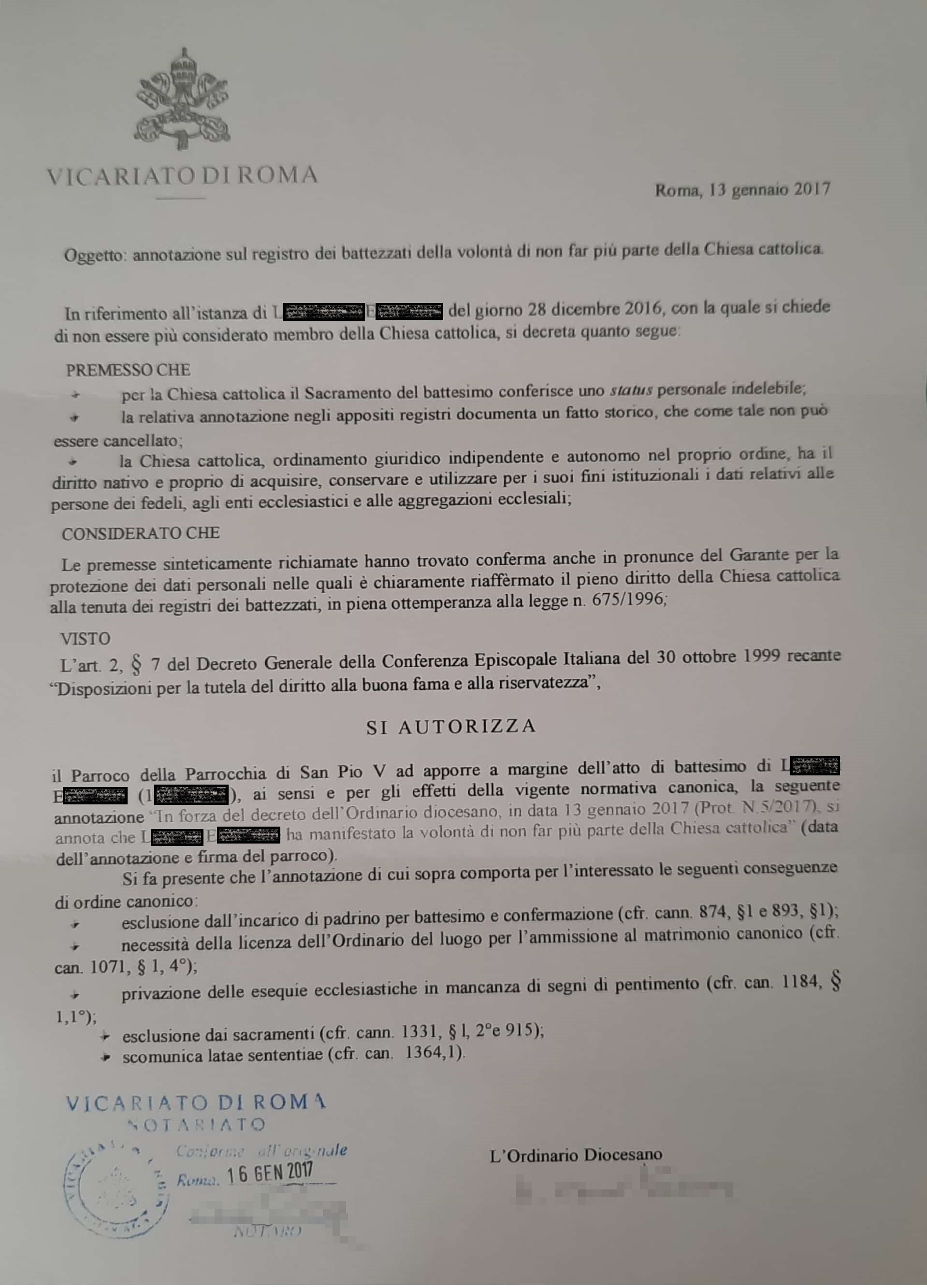 Una persona ha chiesto la rettifica dei dati relativi al proprio battesimo avvenuto a S. Pio V - ROMA (RM) il 16/01/2017, dichiarando di non voler più far parte della Chiesa Cattolica.