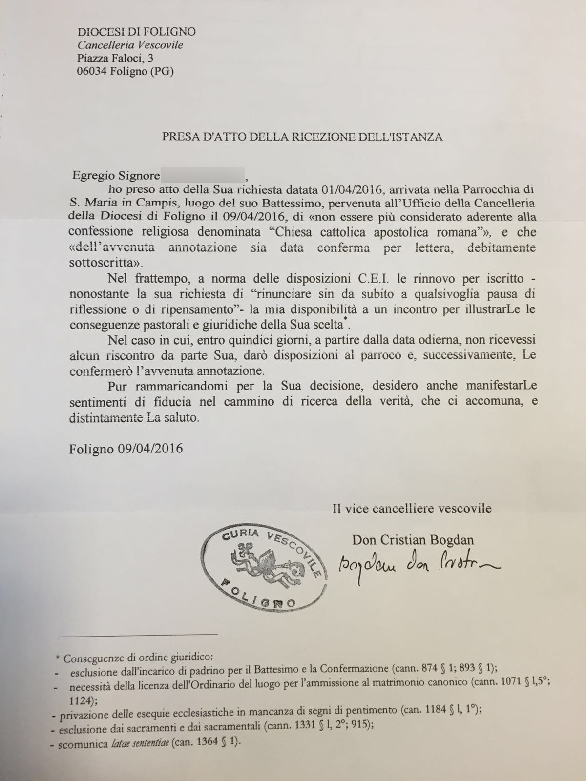 Una persona ha chiesto la rettifica dei dati relativi al proprio battesimo avvenuto a S. Maria in Campis - FOLIGNO (PG) il 10/04/2016, dichiarando di non voler più far parte della Chiesa Cattolica.
