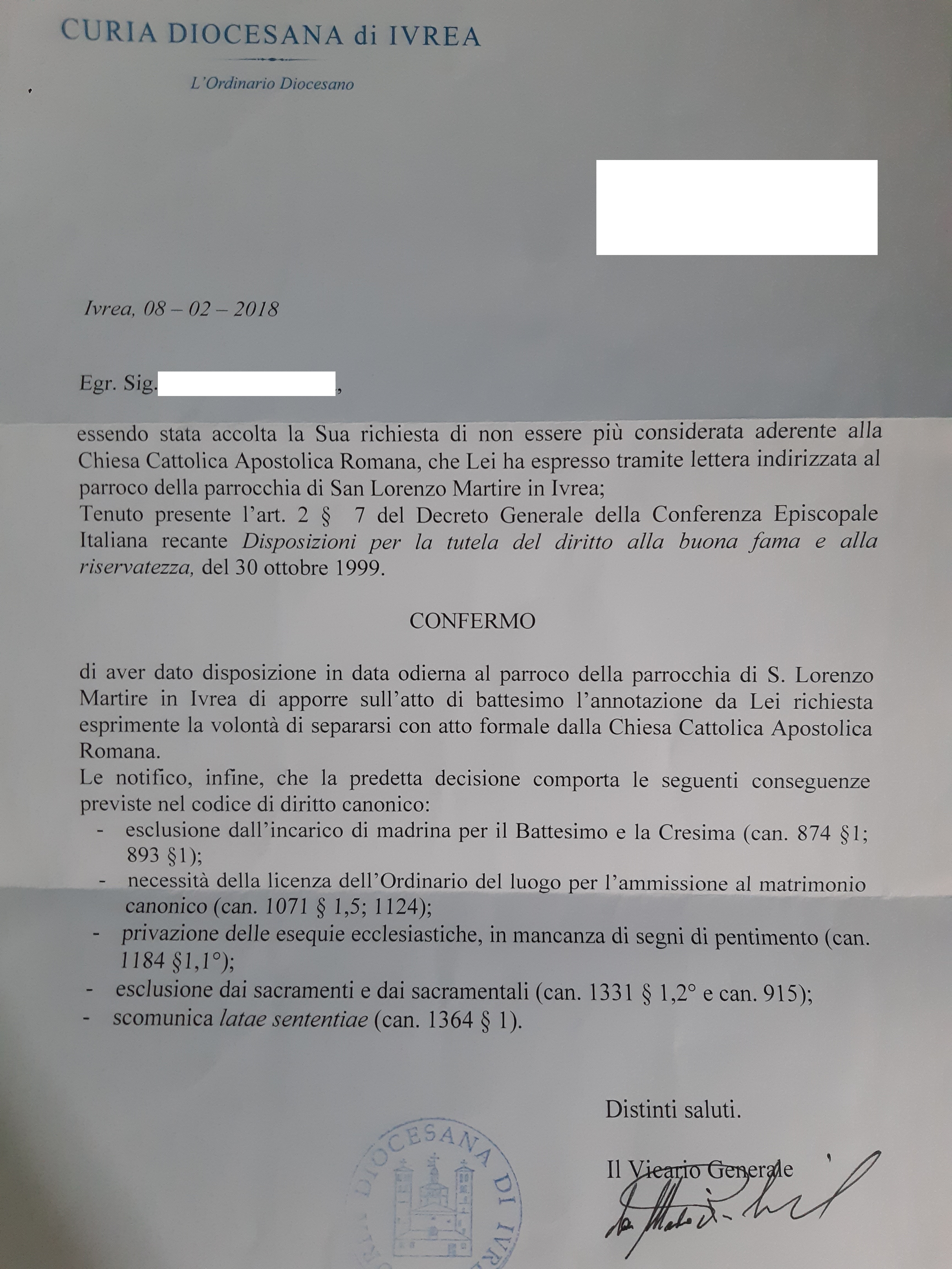Una persona ha chiesto la rettifica dei dati relativi al proprio battesimo avvenuto a S. Lorenzo Martire - IVREA (TO) il 08/08/2018, dichiarando di non voler più far parte della Chiesa Cattolica.
