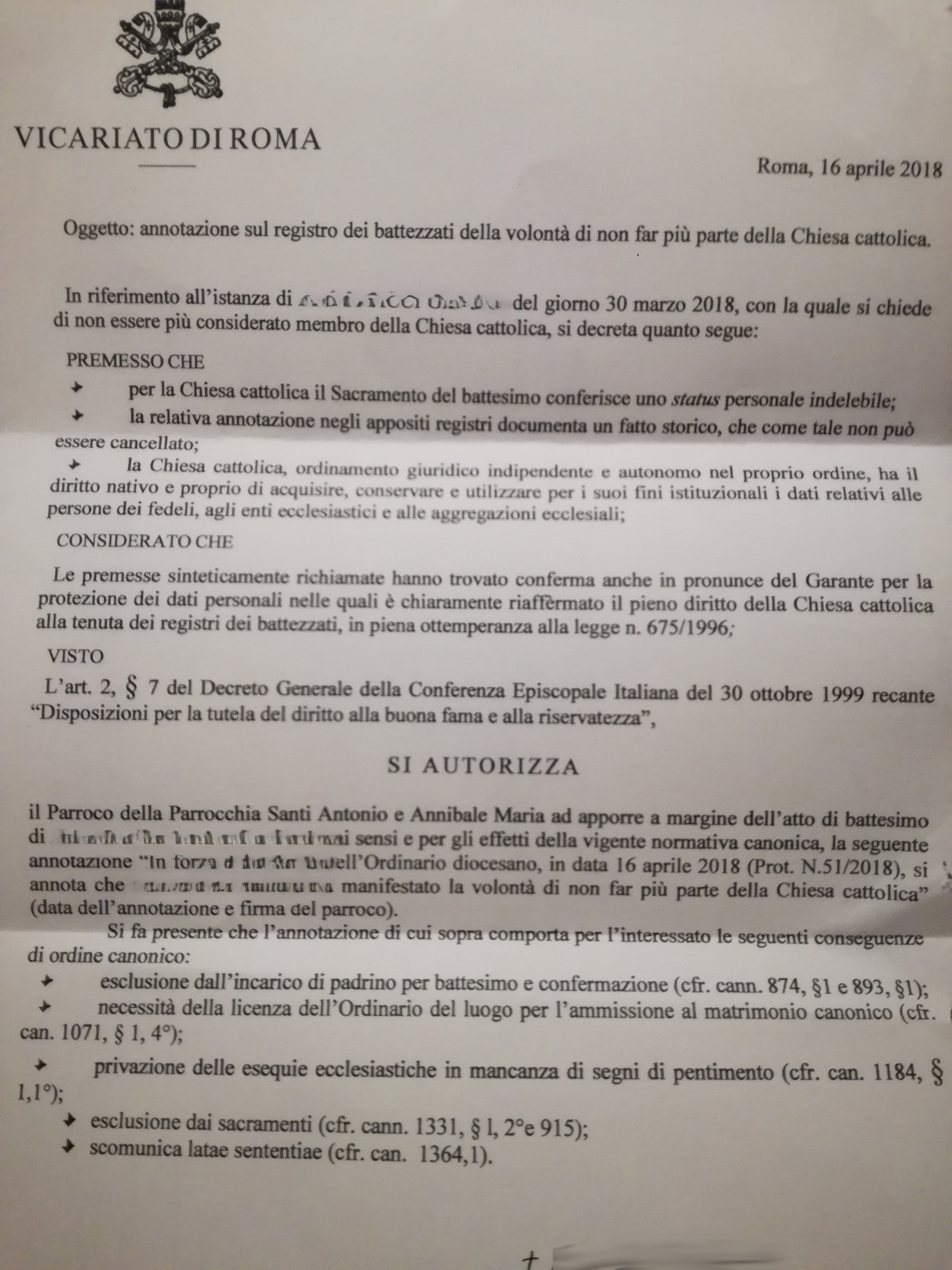 Una persona ha chiesto la rettifica dei dati relativi al proprio battesimo avvenuto a Santi Antonio e Annibale Maria - ROMA (RM) il 16/04/2018, dichiarando di non voler più far parte della Chiesa Cattolica.