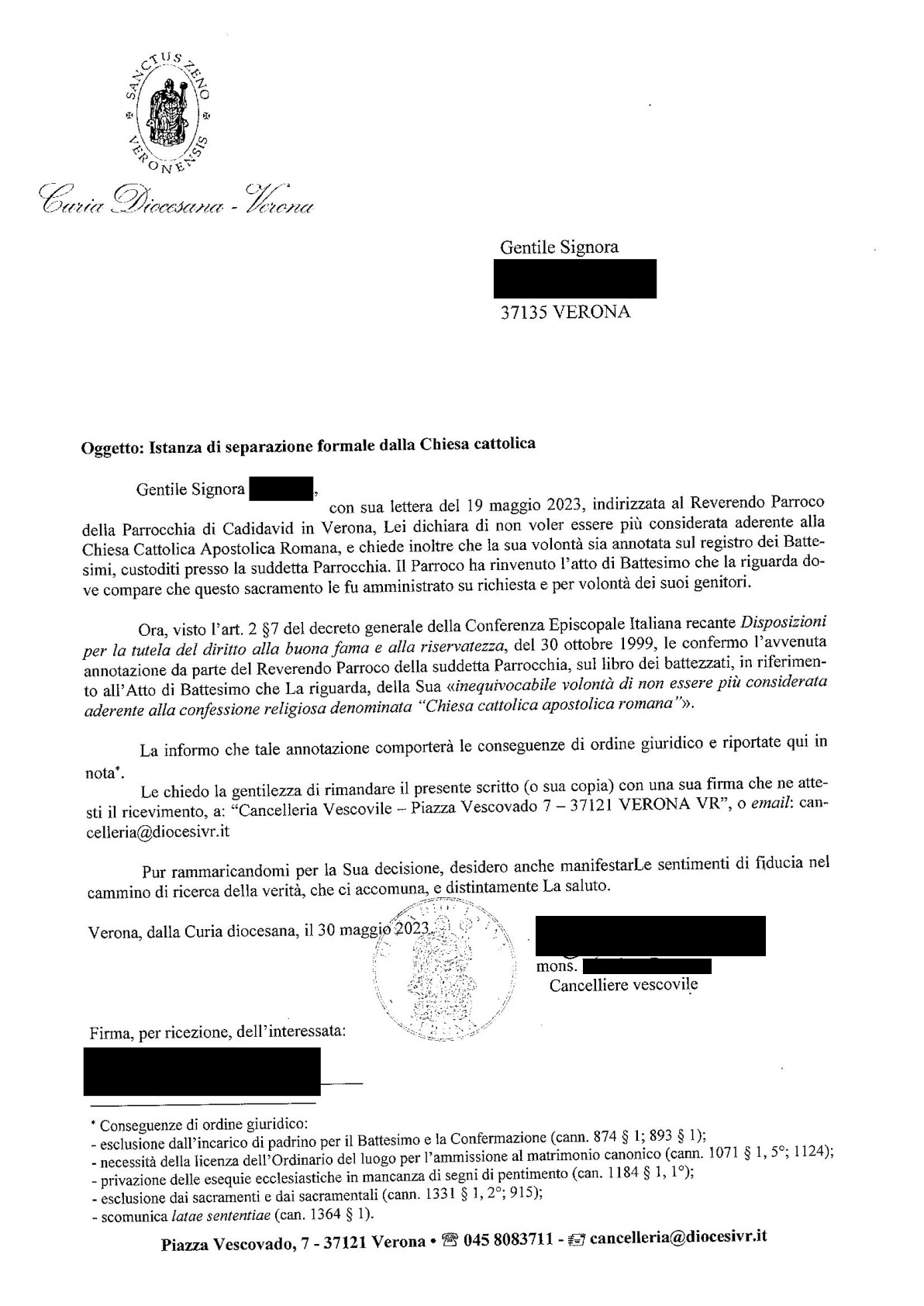 Una persona ha chiesto la rettifica dei dati relativi al proprio battesimo avvenuto a San Giovanni Battista - VERONA (VR) il 30/05/2023, dichiarando di non voler più far parte della Chiesa Cattolica.