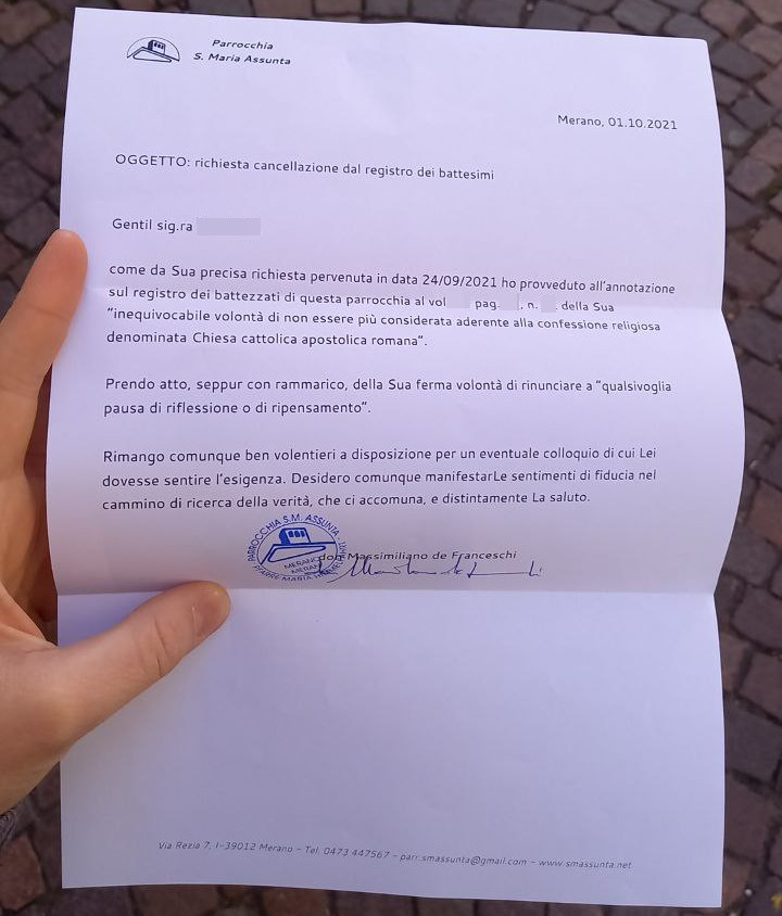Una persona ha chiesto la rettifica dei dati relativi al proprio battesimo avvenuto a S. Maria Assunta - MERANO (BZ) il 01/10/2021, dichiarando di non voler più far parte della Chiesa Cattolica.