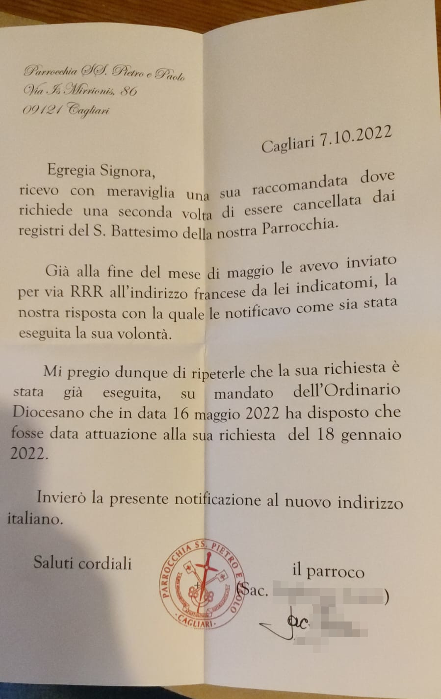 Una persona ha chiesto la rettifica dei dati relativi al proprio battesimo avvenuto a Santi Pietro e Paolo - CAGLIARI (CA) il 07/10/2022, dichiarando di non voler più far parte della Chiesa Cattolica.