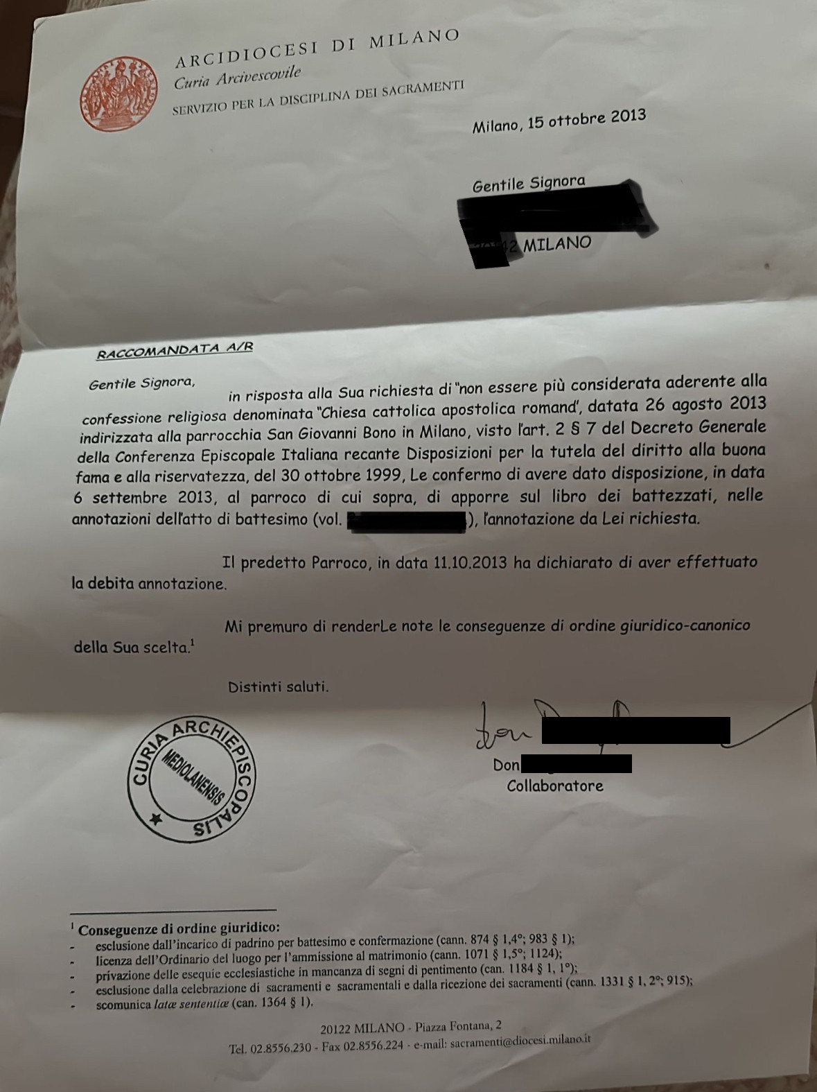 Una persona ha chiesto la rettifica dei dati relativi al proprio battesimo avvenuto a S. Giovanni Bono - MILANO (MI) il 11/10/2013, dichiarando di non voler più far parte della Chiesa Cattolica.