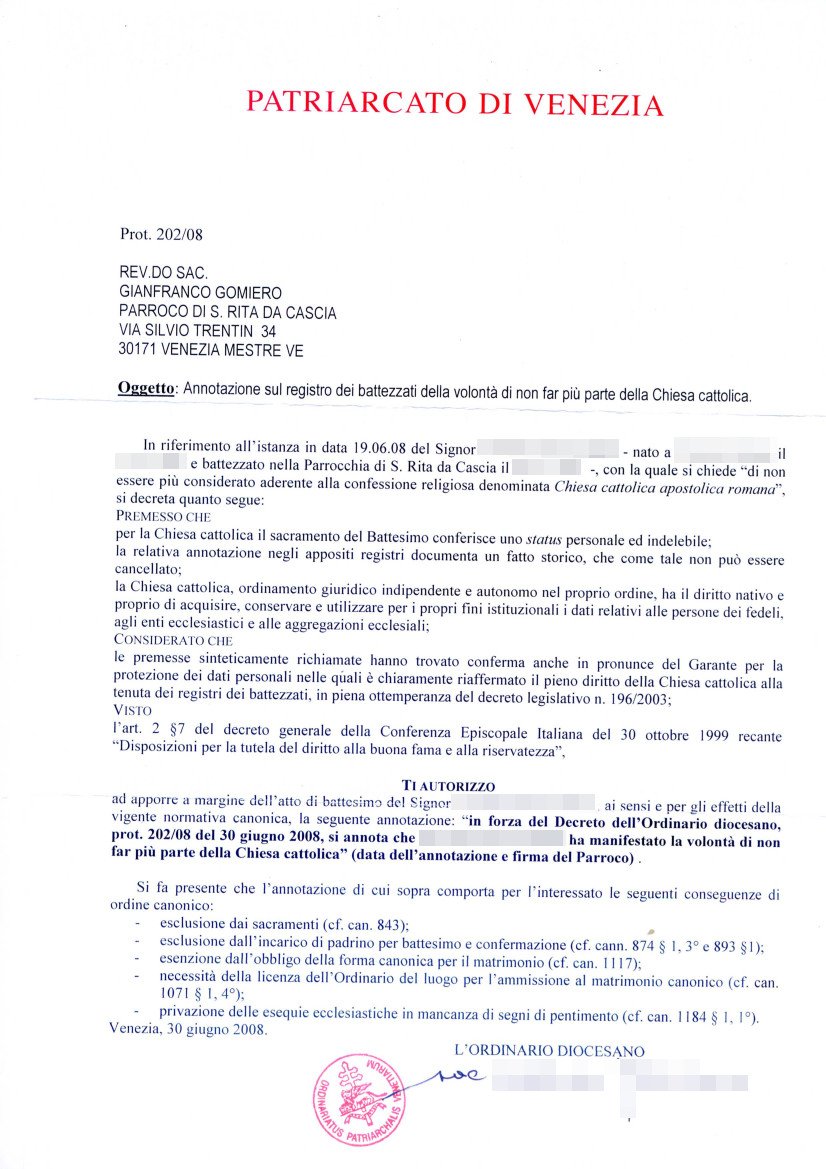 Una persona ha chiesto la rettifica dei dati relativi al proprio battesimo avvenuto a S. Rita da Cascia - VENEZIA (VE) il 30/06/2008, dichiarando di non voler più far parte della Chiesa Cattolica.