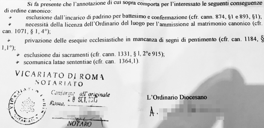 Una persona ha chiesto la rettifica dei dati relativi al proprio battesimo avvenuto a S. Nicola di Bari - ROMA (RM) il 24/05/2013, dichiarando di non voler più far parte della Chiesa Cattolica.