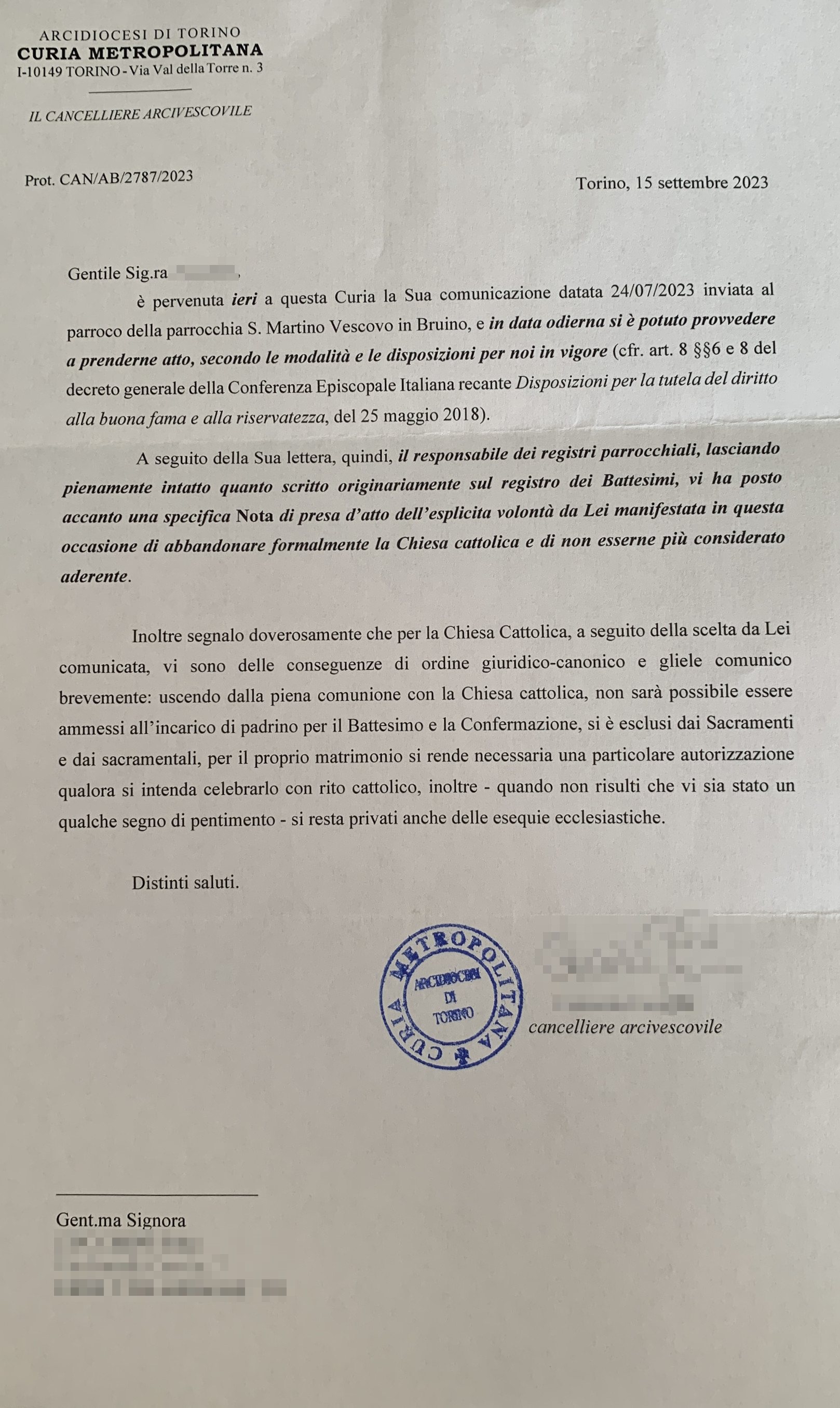 Una persona ha chiesto la rettifica dei dati relativi al proprio battesimo avvenuto a San Martino Vescovo - BRUINO (TO) il 15/09/2023, dichiarando di non voler più far parte della Chiesa Cattolica.