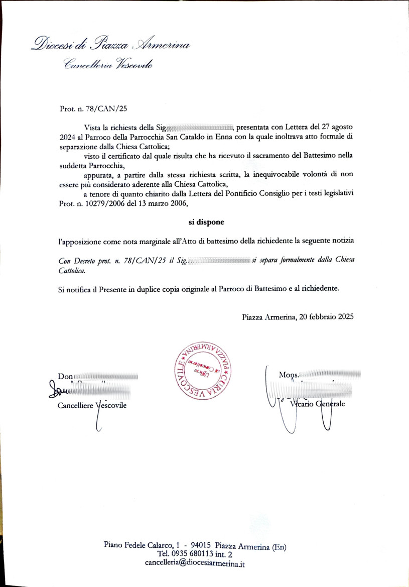 Una persona ha chiesto la rettifica dei dati relativi al proprio battesimo avvenuto a S. Cataldo - ENNA (EN) il 20/02/2025, dichiarando di non voler più far parte della Chiesa Cattolica.