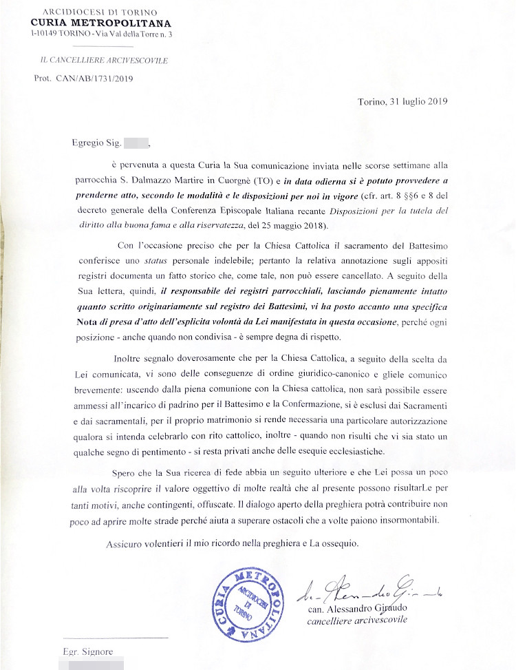 Una persona ha chiesto la rettifica dei dati relativi al proprio battesimo avvenuto a S. Dalmazzo Martire - CUORGNÉ (TO) il 31/07/2019, dichiarando di non voler più far parte della Chiesa Cattolica.