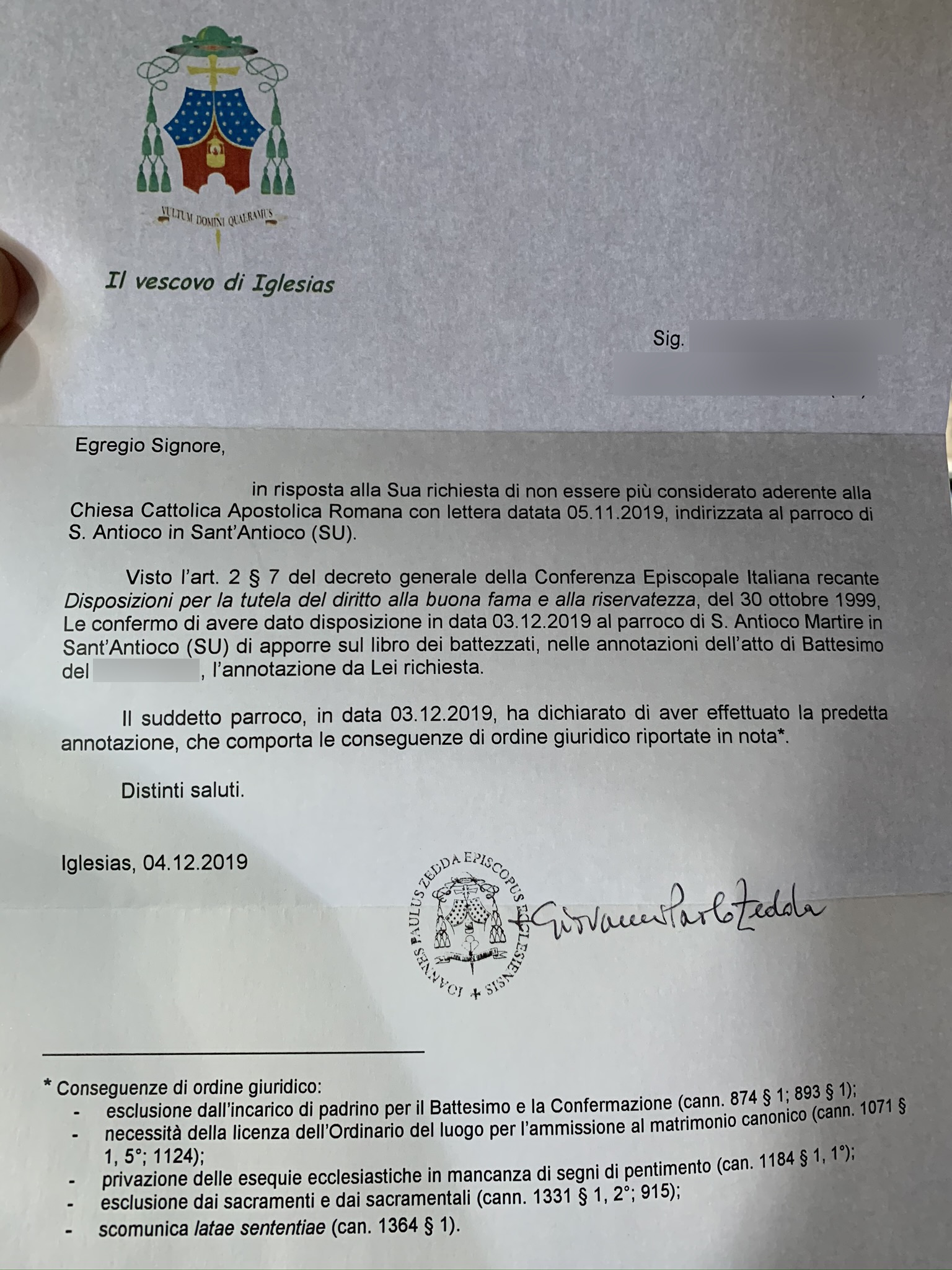 Una persona ha chiesto la rettifica dei dati relativi al proprio battesimo avvenuto a S. Antioco Martire - SANT'ANTIOCO (SU) il 03/12/2019, dichiarando di non voler più far parte della Chiesa Cattolica.