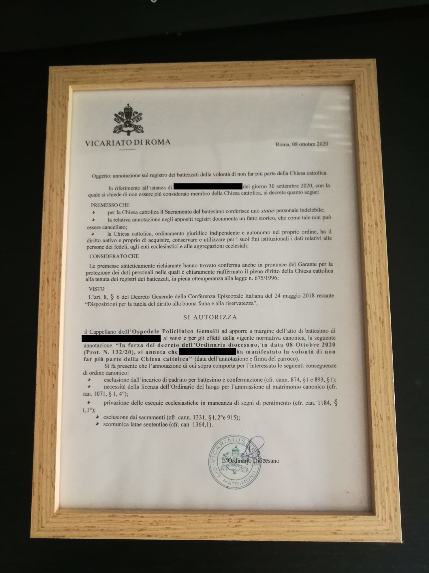 Una persona ha chiesto la rettifica dei dati relativi al proprio battesimo avvenuto a Policlinico Agostino Gemelli - ROMA (RM) il 08/10/2020, dichiarando di non voler più far parte della Chiesa Cattolica.
