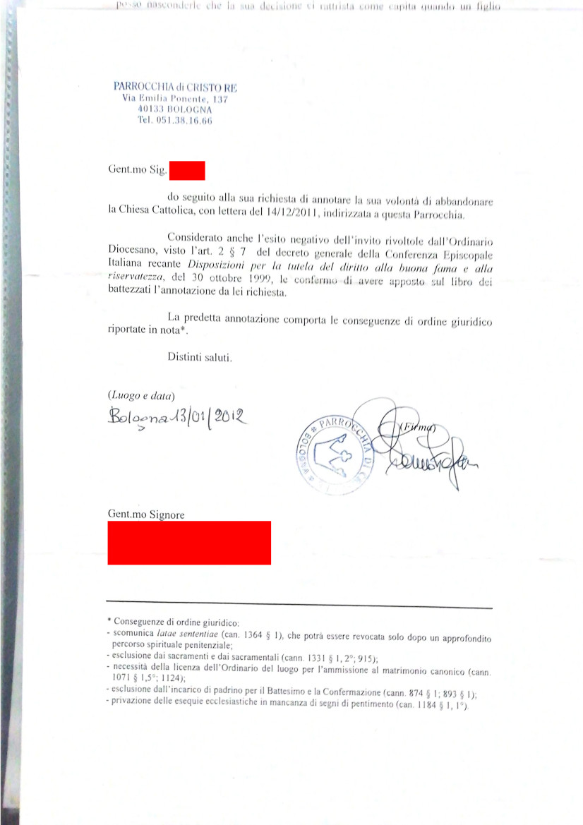 Una persona ha chiesto la rettifica dei dati relativi al proprio battesimo avvenuto a Cristo Re - BOLOGNA (BO) il 13/01/2012, dichiarando di non voler più far parte della Chiesa Cattolica.