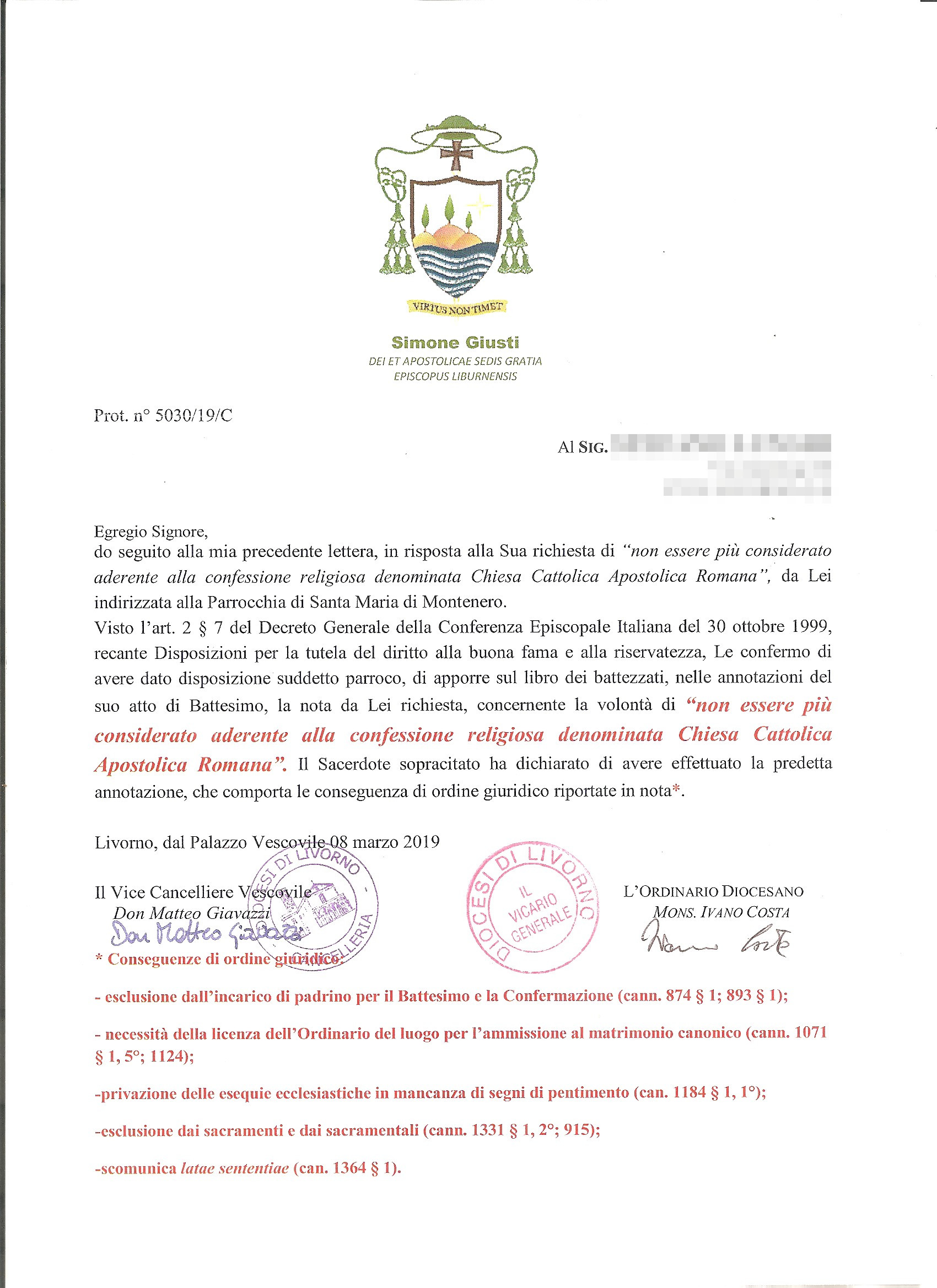 Una persona ha chiesto la rettifica dei dati relativi al proprio battesimo avvenuto a S. Maria di Montenero - LIVORNO (LI) il 30/05/2019, dichiarando di non voler più far parte della Chiesa Cattolica.