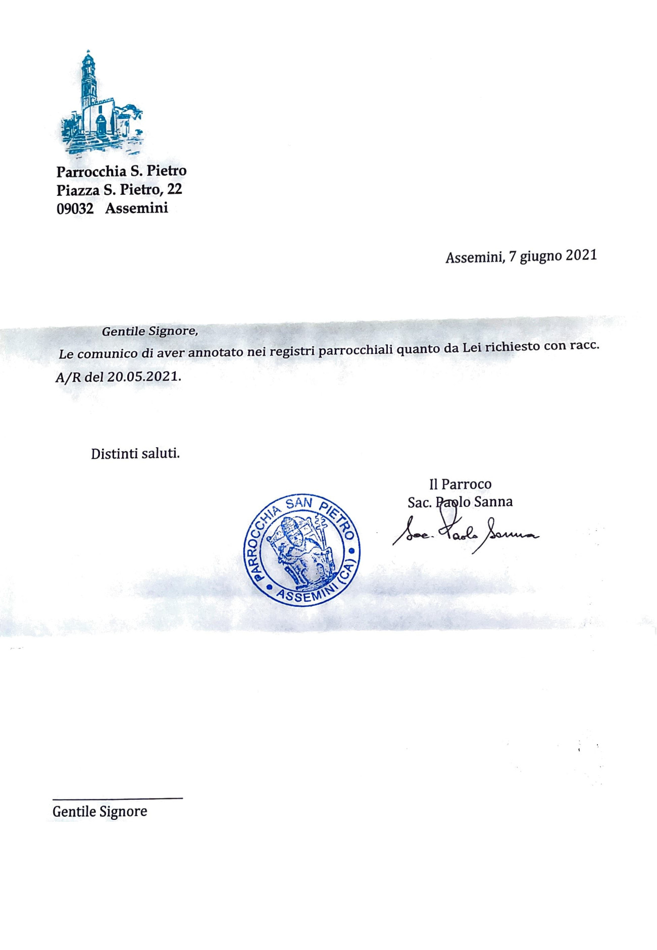 Una persona ha chiesto la rettifica dei dati relativi al proprio battesimo avvenuto a S. Pietro - ASSEMINI (CA) il 07/06/2021, dichiarando di non voler più far parte della Chiesa Cattolica.