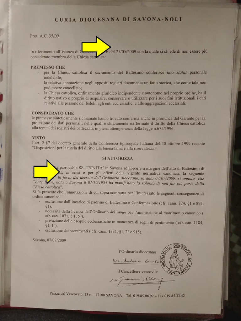 Una persona ha chiesto la rettifica dei dati relativi al proprio battesimo avvenuto a Ss. Trinità - SAVONA (SV) il 07/07/2009, dichiarando di non voler più far parte della Chiesa Cattolica.