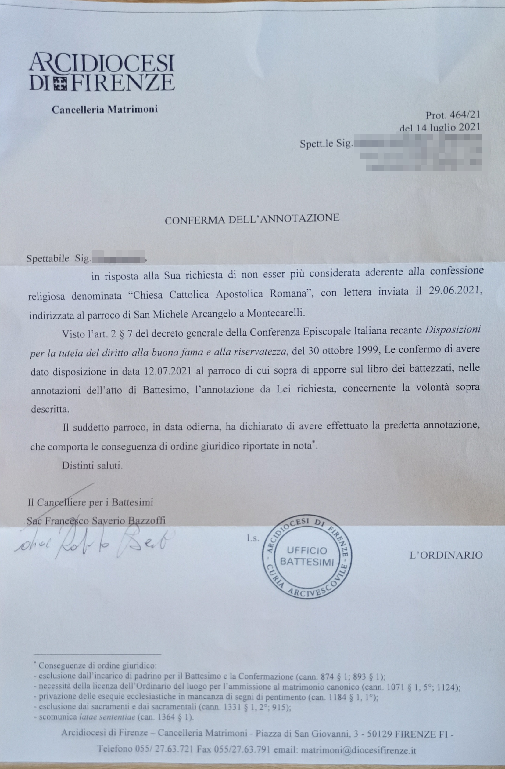 Una persona ha chiesto la rettifica dei dati relativi al proprio battesimo avvenuto a San Michele Arcangelo - BARBERINO DI MUGELLO (FI) il 22/07/2021, dichiarando di non voler più far parte della Chiesa Cattolica.