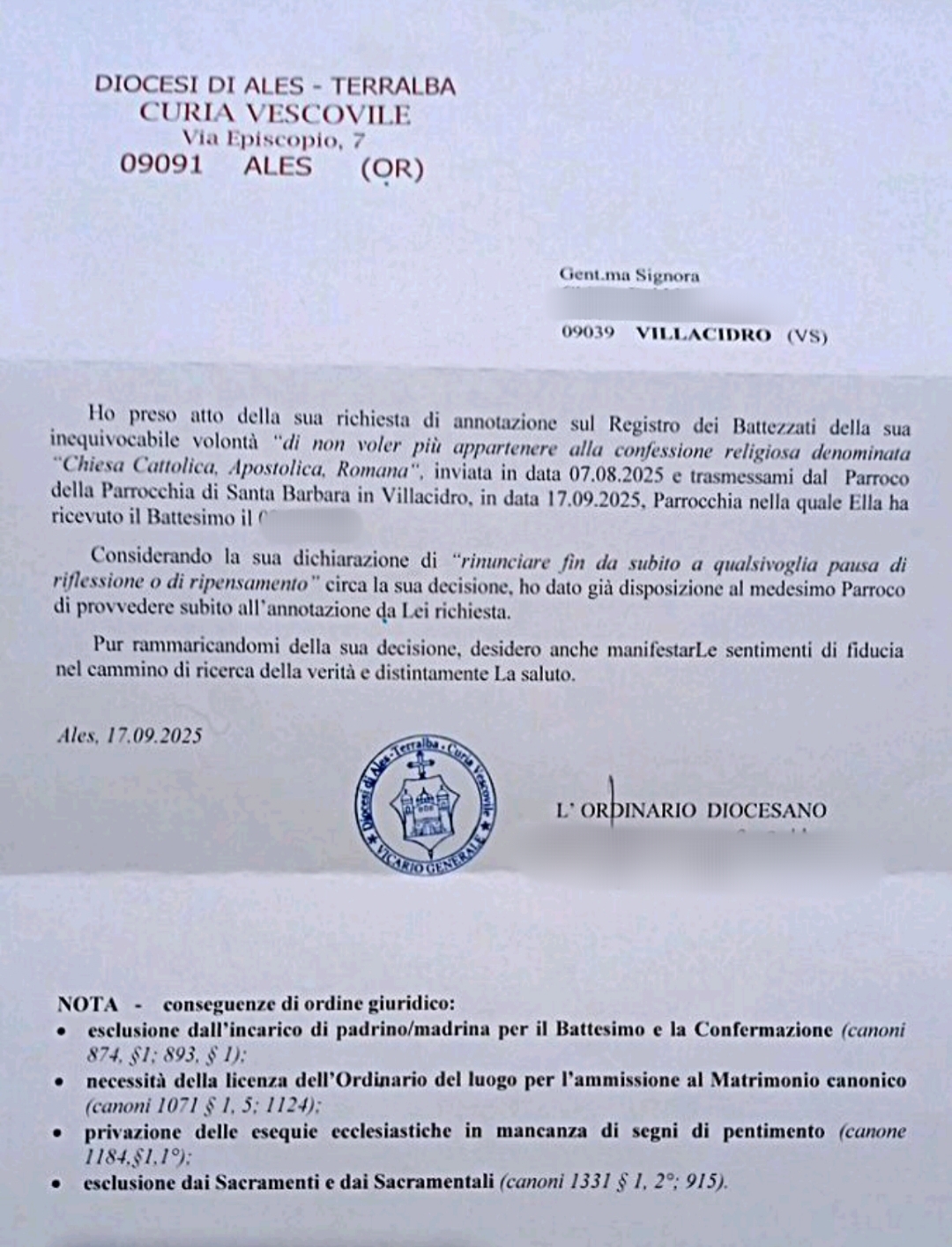 Una persona ha chiesto la rettifica dei dati relativi al proprio battesimo avvenuto a S. Barbara - VILLACIDRO (SU) il 17/09/2025, dichiarando di non voler più far parte della Chiesa Cattolica.
