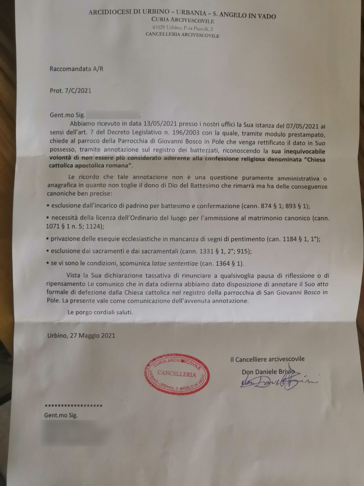 Una persona ha chiesto la rettifica dei dati relativi al proprio battesimo avvenuto a S. Giovanni Bosco - ACQUALAGNA (PU) il 27/05/2021, dichiarando di non voler più far parte della Chiesa Cattolica.