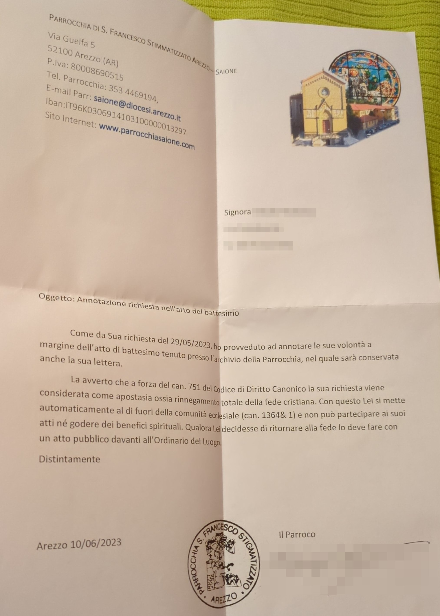 Una persona ha chiesto la rettifica dei dati relativi al proprio battesimo avvenuto a S. Francesco Stigmatizzato in Saione - AREZZO (AR) il 10/06/2023, dichiarando di non voler più far parte della Chiesa Cattolica.
