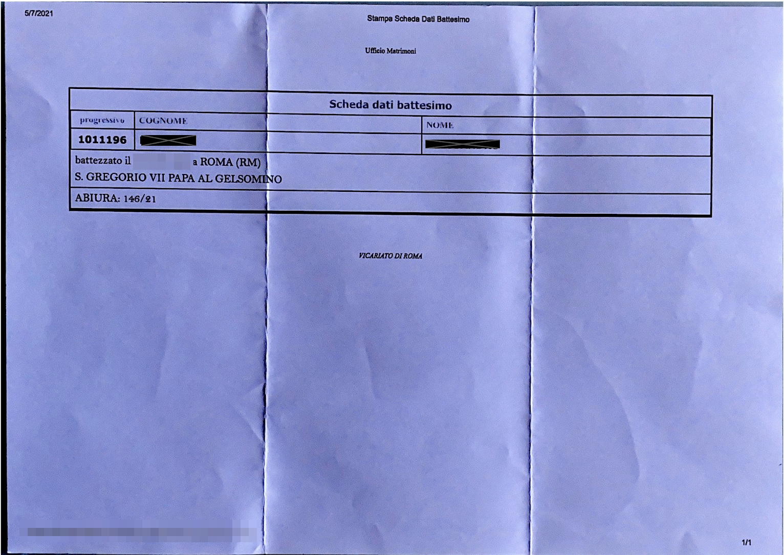 Una persona ha chiesto la rettifica dei dati relativi al proprio battesimo avvenuto a S. Gregorio VII - ROMA (RM) il 05/07/2021, dichiarando di non voler più far parte della Chiesa Cattolica.