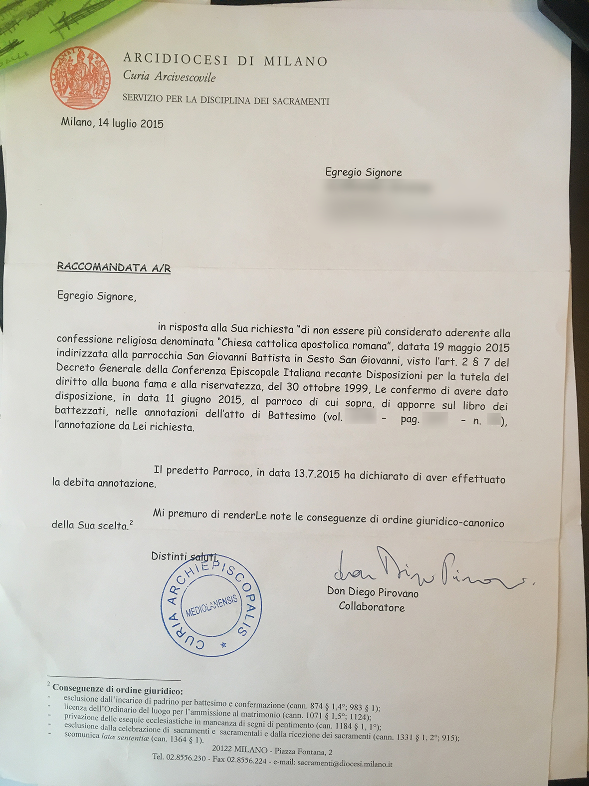 Una persona ha chiesto la rettifica dei dati relativi al proprio battesimo avvenuto a S. Giovanni Battista - SESTO SAN GIOVANNI (MI) il 14/07/2015, dichiarando di non voler più far parte della Chiesa Cattolica.