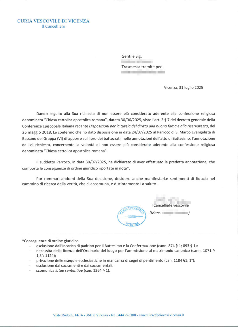 Una persona ha chiesto la rettifica dei dati relativi al proprio battesimo avvenuto a S. Marco Evangelista - BASSANO DEL GRAPPA (VI) il 08/08/2025, dichiarando di non voler più far parte della Chiesa Cattolica.