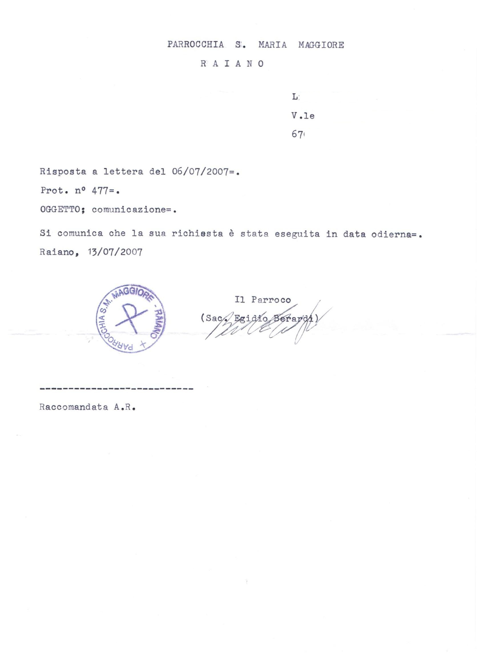 Una persona ha chiesto la rettifica dei dati relativi al proprio battesimo avvenuto a S. Maria Maggiore - RAIANO (AQ) il 13/07/2007, dichiarando di non voler più far parte della Chiesa Cattolica.