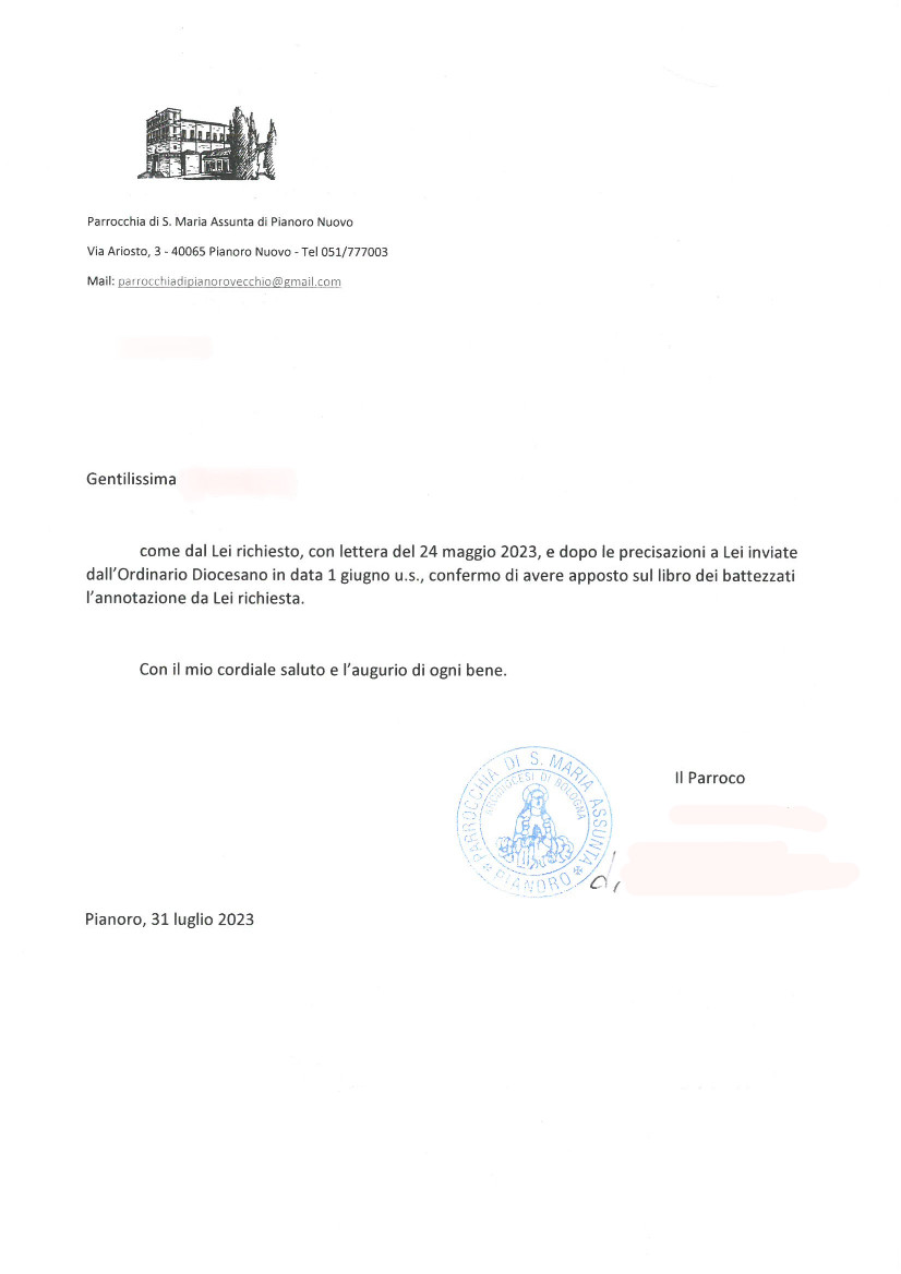 Una persona ha chiesto la rettifica dei dati relativi al proprio battesimo avvenuto a S. Maria Assunta - PIANORO (BO) il 03/08/2023, dichiarando di non voler più far parte della Chiesa Cattolica.