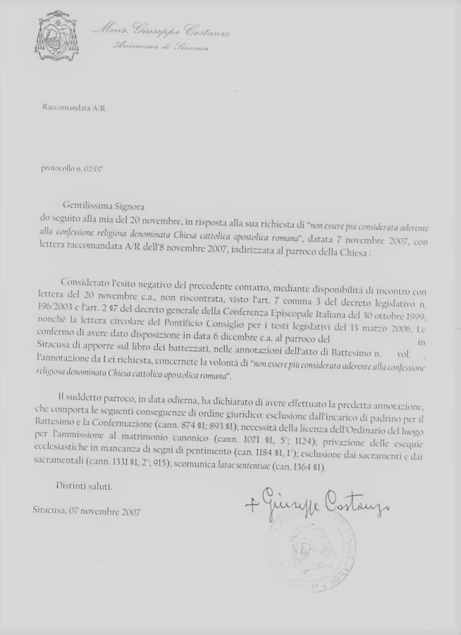 Una persona ha chiesto la rettifica dei dati relativi al proprio battesimo avvenuto a Sacro Cuore di Gesù - SIRACUSA (SR) il 20/11/2007, dichiarando di non voler più far parte della Chiesa Cattolica.