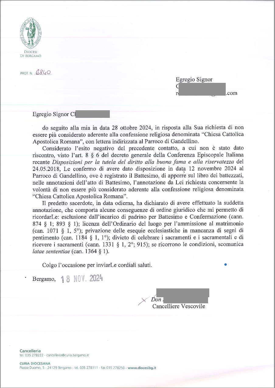 Una persona ha chiesto la rettifica dei dati relativi al proprio battesimo avvenuto a S. Maria Nascente - GANDELLINO (BG) il 18/11/2024, dichiarando di non voler più far parte della Chiesa Cattolica.