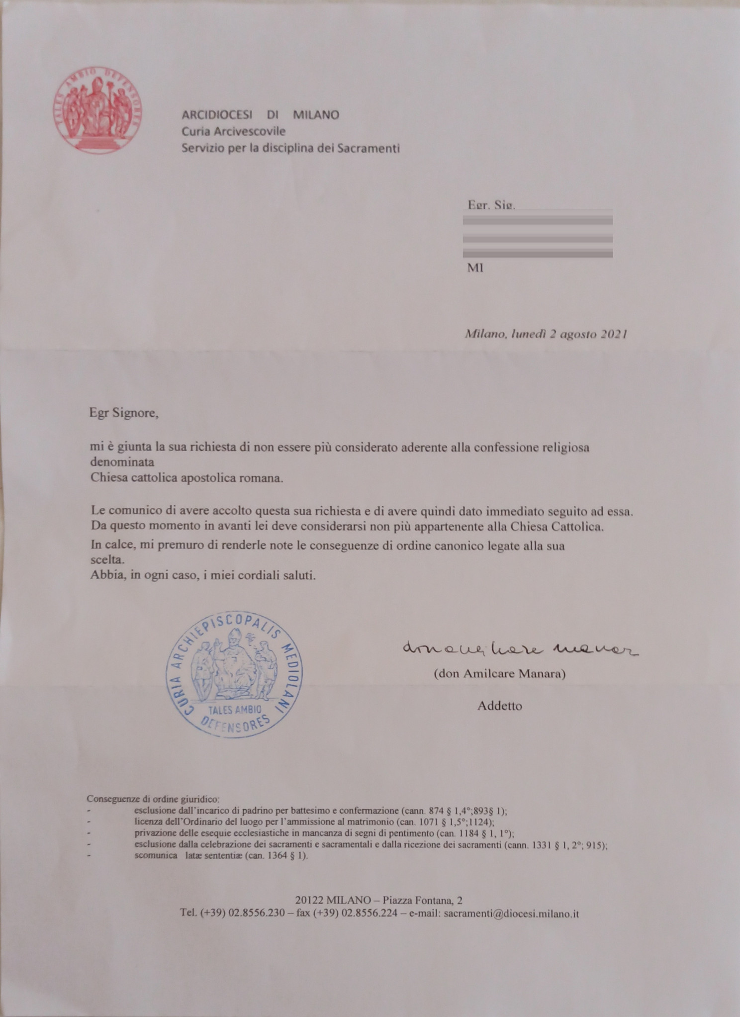 Una persona ha chiesto la rettifica dei dati relativi al proprio battesimo avvenuto a S. Stefano Prot. - TAINO (VA) il 06/08/2021, dichiarando di non voler più far parte della Chiesa Cattolica.