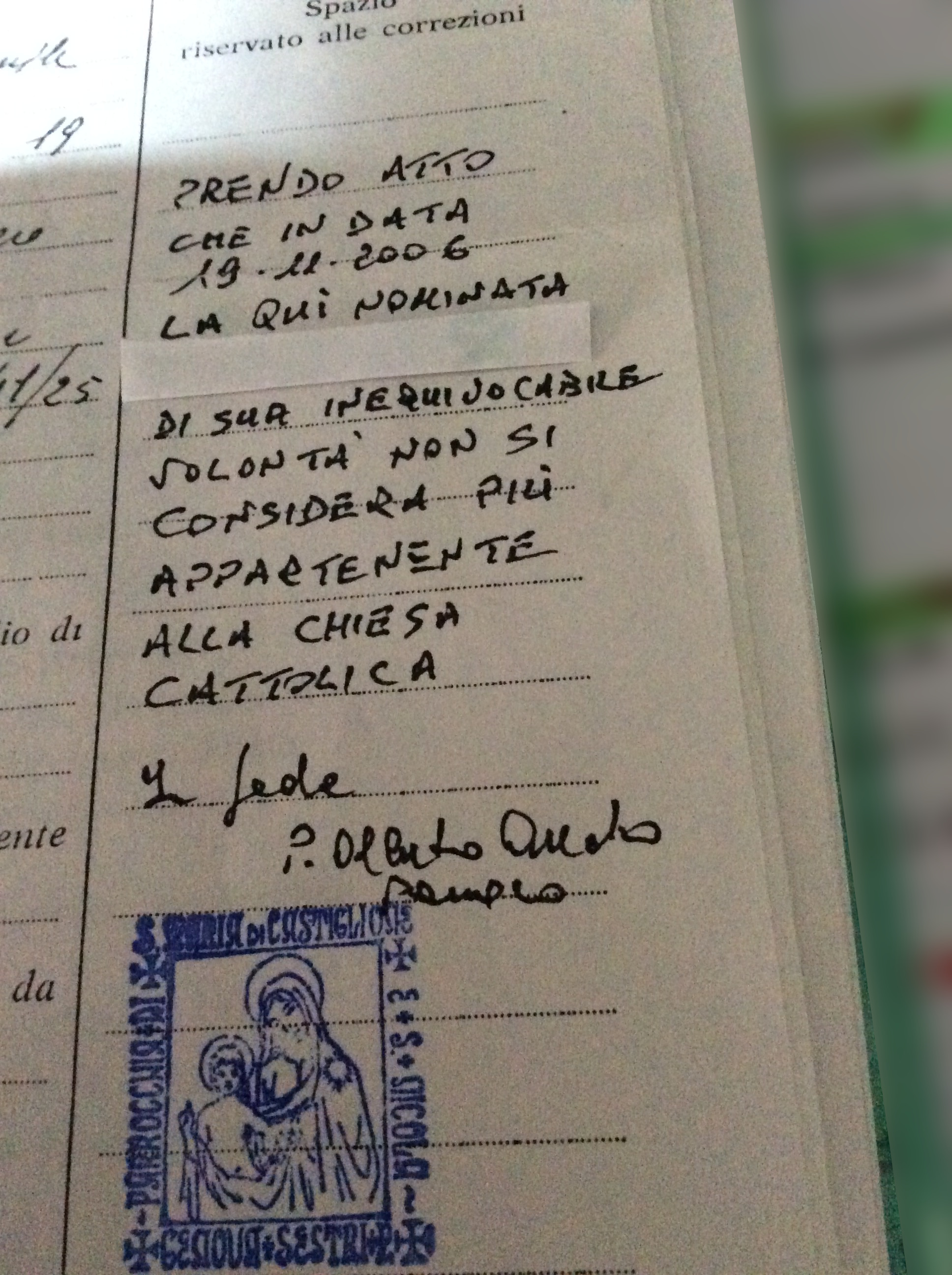 Una persona ha chiesto la rettifica dei dati relativi al proprio battesimo avvenuto a San Nicola da Tolentino - GENOVA (GE) il 19/11/2006, dichiarando di non voler più far parte della Chiesa Cattolica.