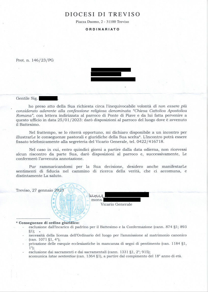 Una persona ha chiesto la rettifica dei dati relativi al proprio battesimo avvenuto a S. Tommaso di Canterbury - PONTE DI PIAVE (TV) il 27/01/2023, dichiarando di non voler più far parte della Chiesa Cattolica.