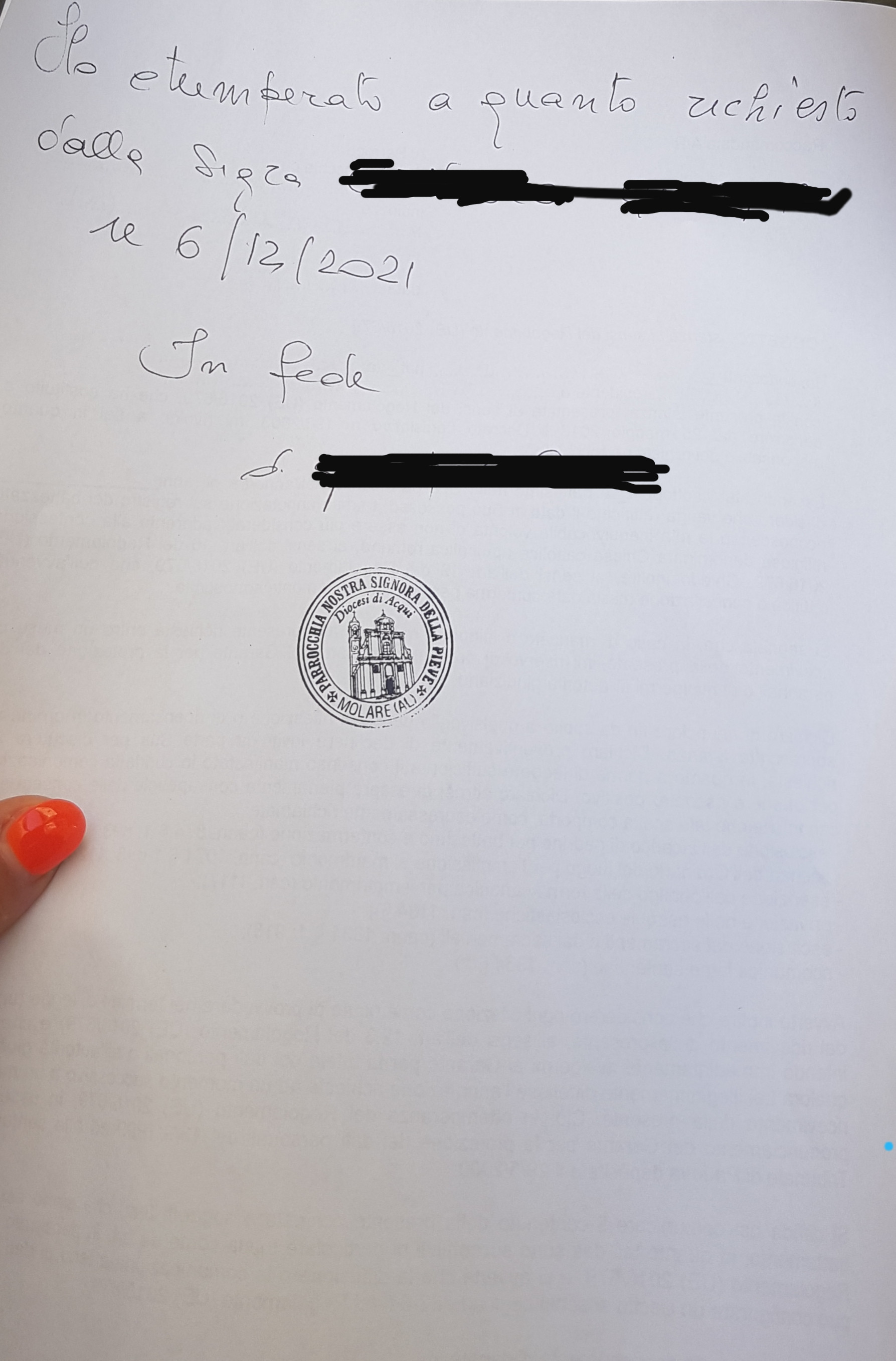 Una persona ha chiesto la rettifica dei dati relativi al proprio battesimo avvenuto a Nostra Signora della Pieve - MOLARE (AL) il 06/12/2021, dichiarando di non voler più far parte della Chiesa Cattolica.