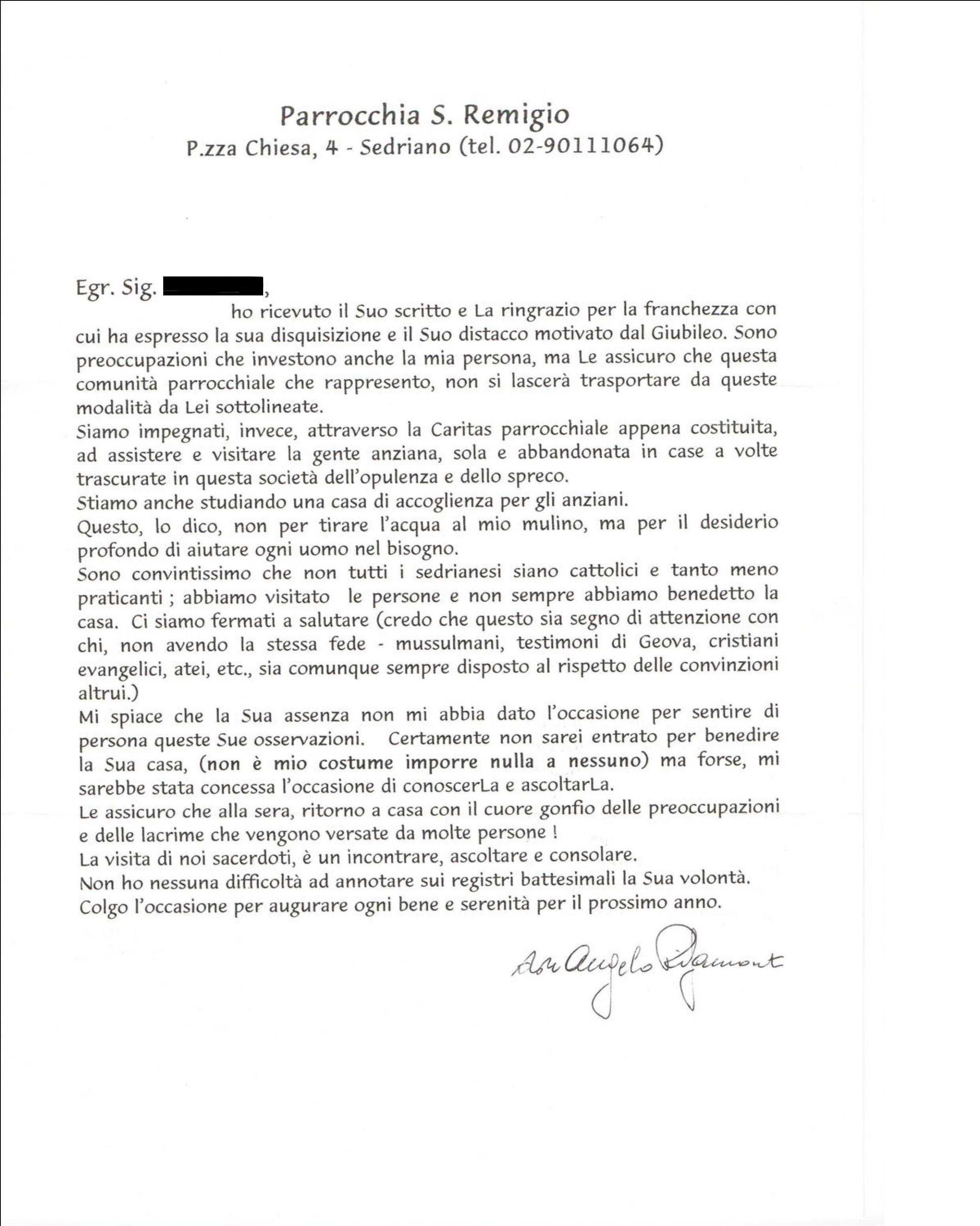 Una persona ha chiesto la rettifica dei dati relativi al proprio battesimo avvenuto a S. Remigio - SEDRIANO (MI) il 20/12/1999, dichiarando di non voler più far parte della Chiesa Cattolica.