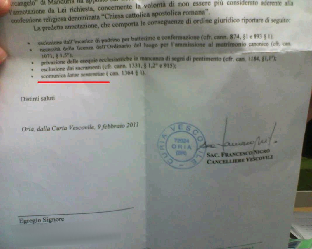 Una persona ha chiesto la rettifica dei dati relativi al proprio battesimo avvenuto a S. Michele Arcangelo - MANDURIA (TA) il 09/02/2011, dichiarando di non voler più far parte della Chiesa Cattolica.