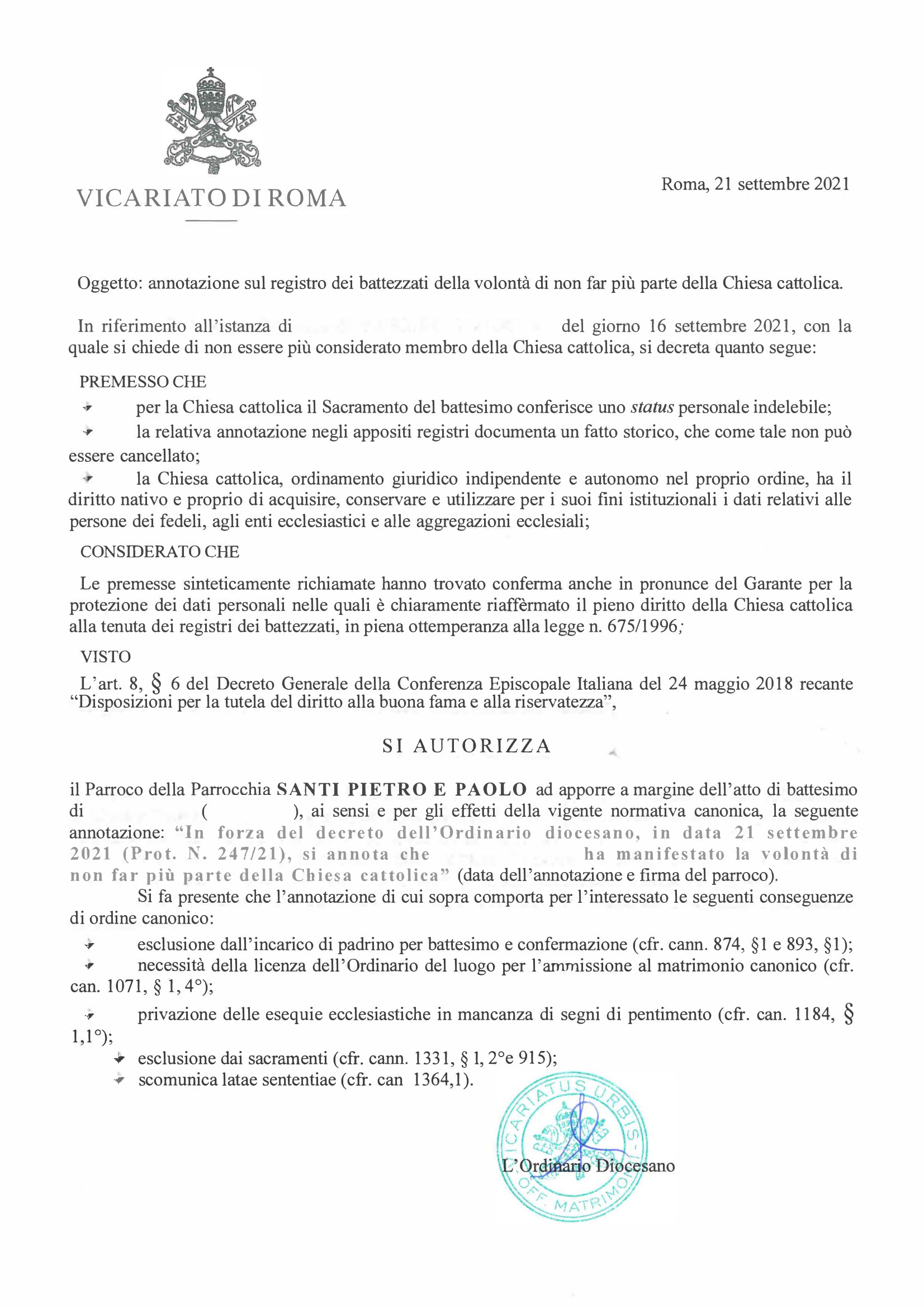 Una persona ha chiesto la rettifica dei dati relativi al proprio battesimo avvenuto a Santi Pietro e Paolo - ROMA (RM) il 21/09/2021, dichiarando di non voler più far parte della Chiesa Cattolica.
