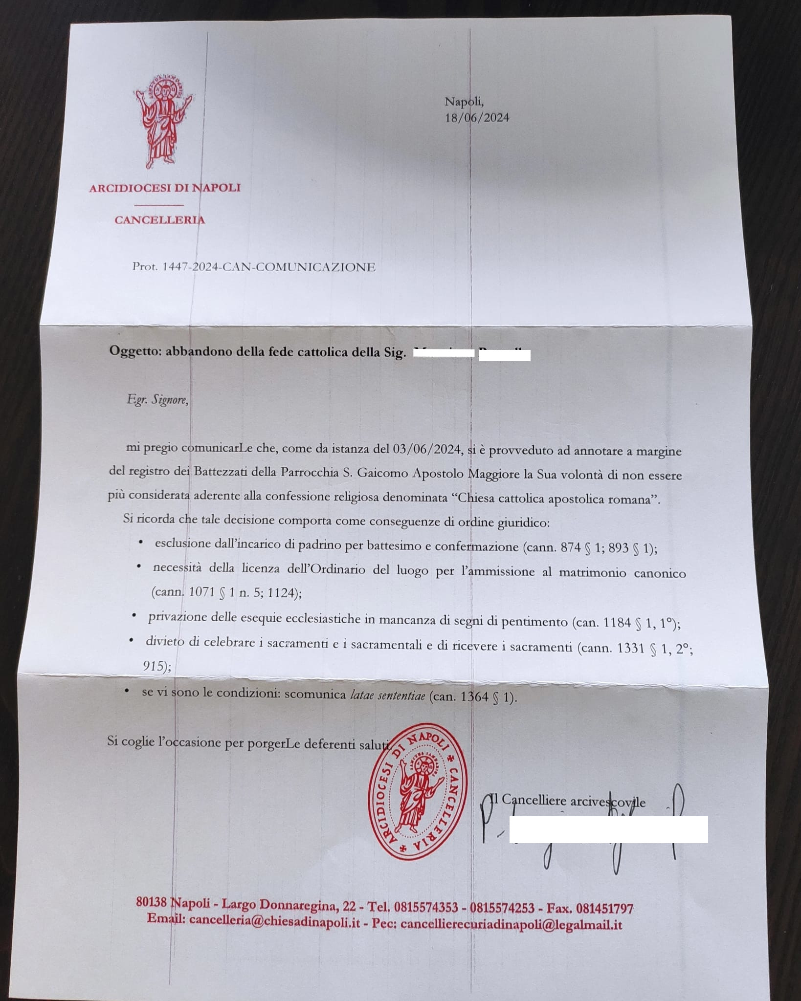 Una persona ha chiesto la rettifica dei dati relativi al proprio battesimo avvenuto a S. Giacomo Maggiore - POLLENA TROCCHIA (NA) il 18/06/2024, dichiarando di non voler più far parte della Chiesa Cattolica.