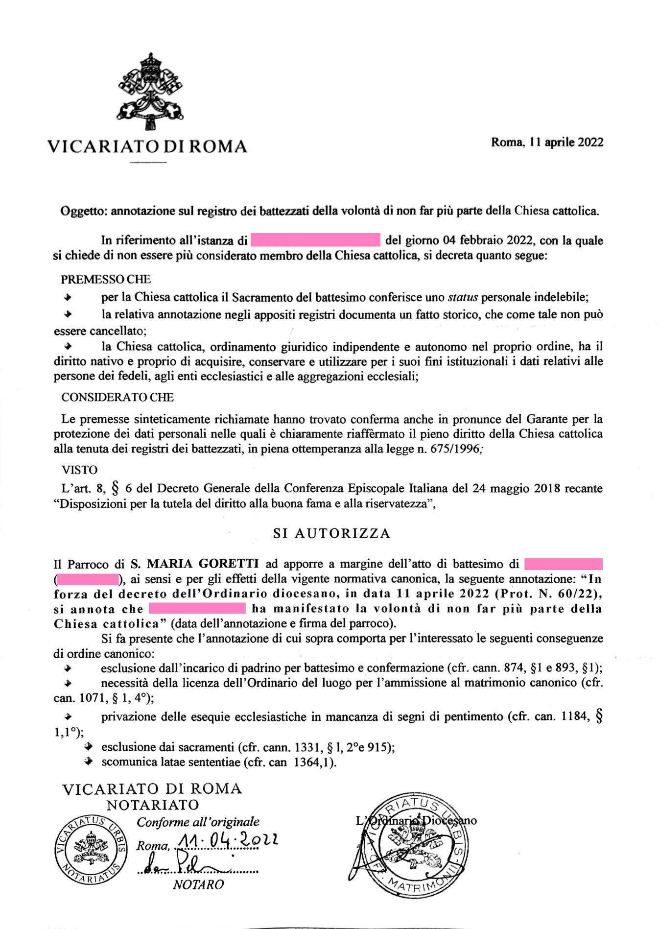 Una persona ha chiesto la rettifica dei dati relativi al proprio battesimo avvenuto a S. Maria Goretti - ROMA (RM) il 20/04/2022, dichiarando di non voler più far parte della Chiesa Cattolica.
