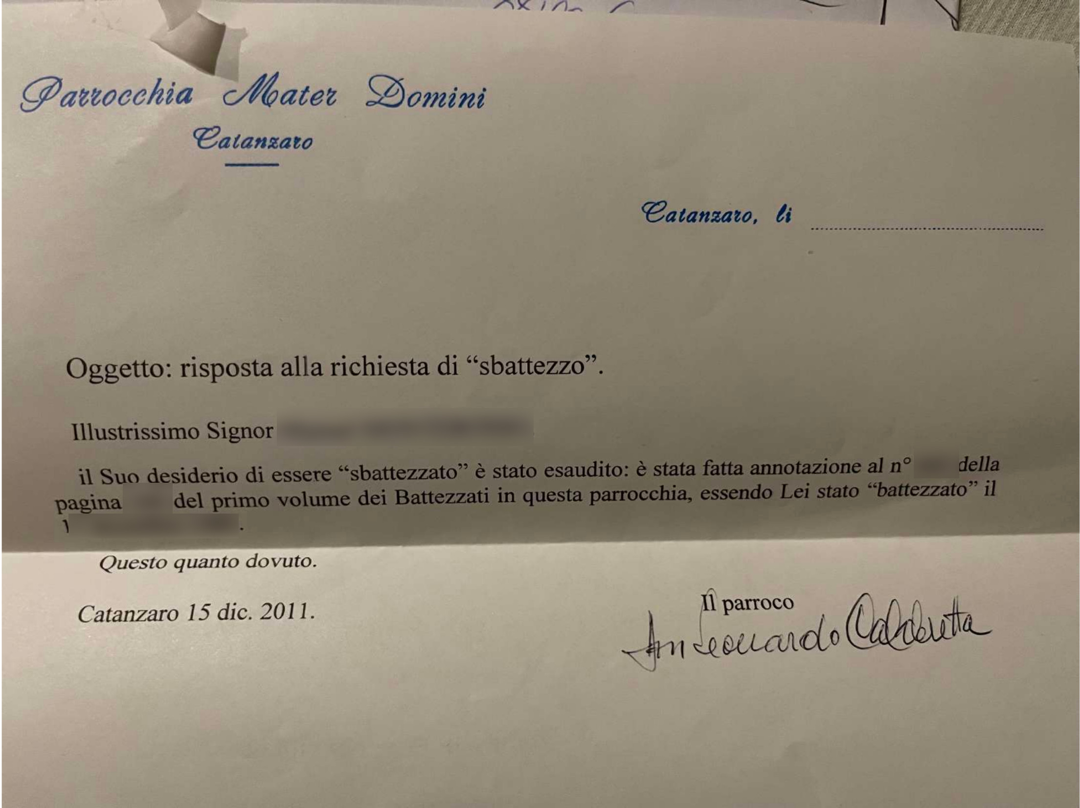 Una persona ha chiesto la rettifica dei dati relativi al proprio battesimo avvenuto a Mater Domini - CATANZARO (CZ) il 15/12/2011, dichiarando di non voler più far parte della Chiesa Cattolica.