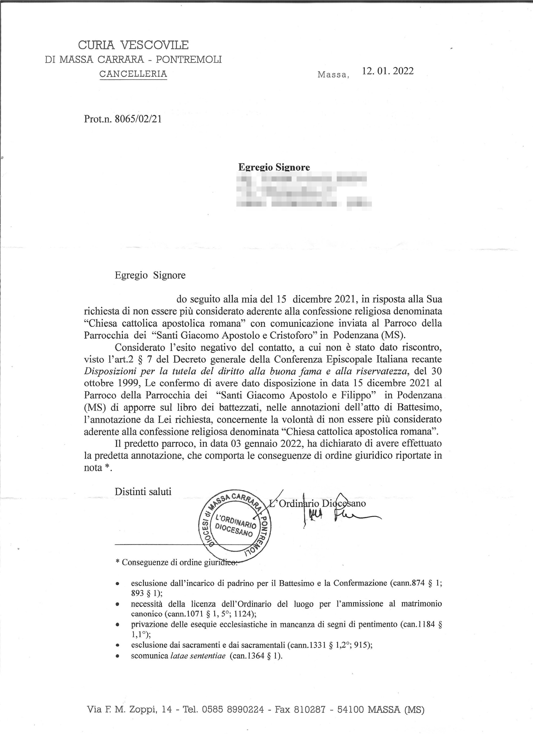 Una persona ha chiesto la rettifica dei dati relativi al proprio battesimo avvenuto a Santi Giacomo Apostolo e Cristoforo - PODENZANA (MS) il 03/01/2022, dichiarando di non voler più far parte della Chiesa Cattolica.