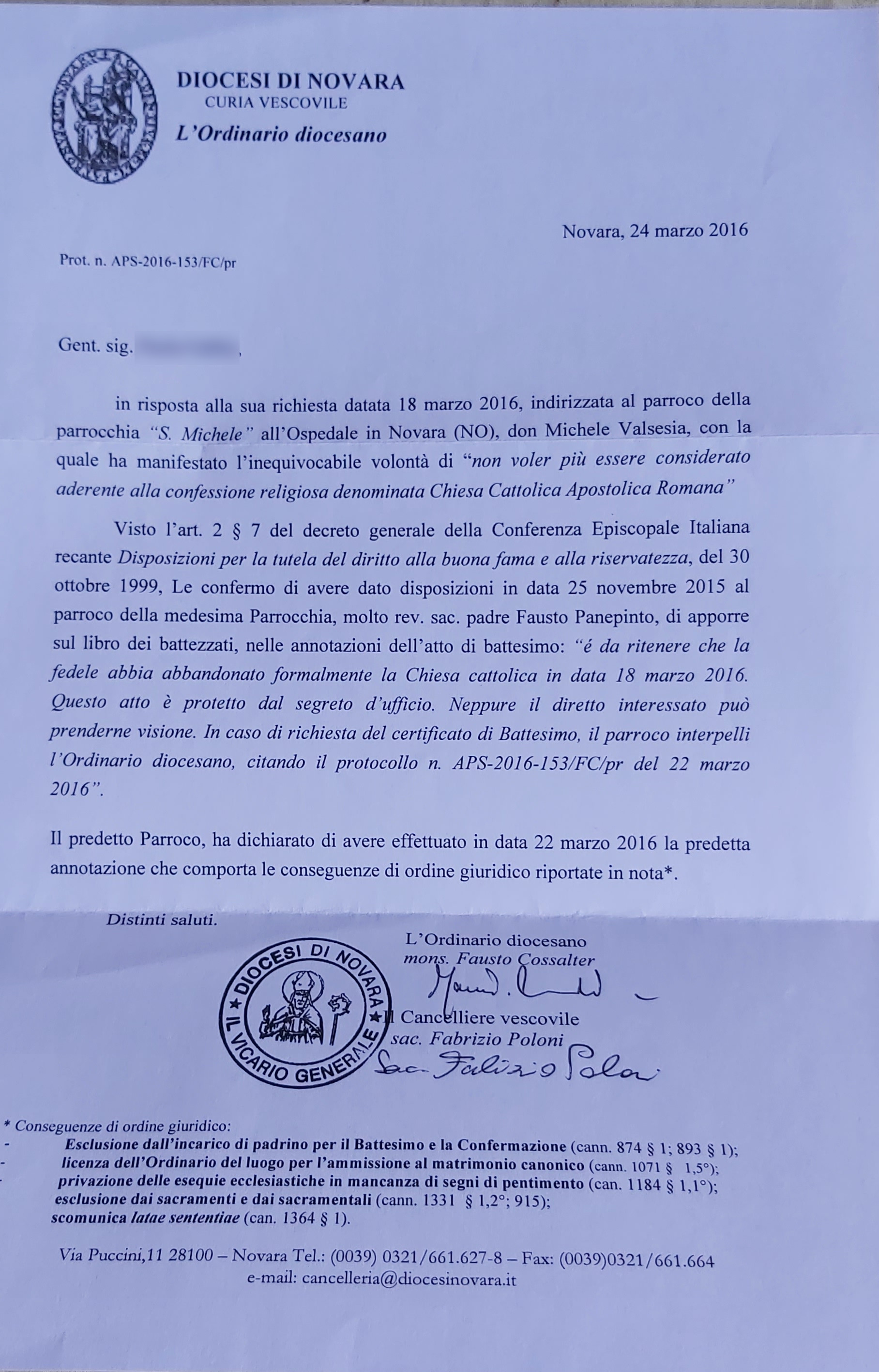 Una persona ha chiesto la rettifica dei dati relativi al proprio battesimo avvenuto a San Michele all'Ospedale - NOVARA (NO) il 22/03/2016, dichiarando di non voler più far parte della Chiesa Cattolica.